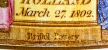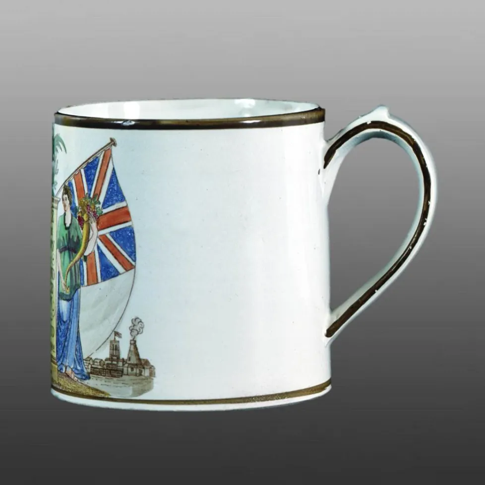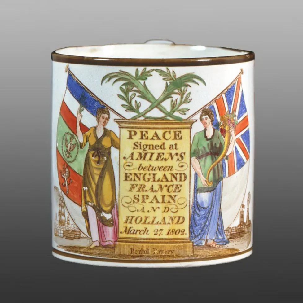 Earthenware mug, transfer-printed in brown and hand-colored. The design of this mug shows two female figures in classical dress standing before the flags of the signing nations, holding a laurel branch and a cornucopia. The monument at which they stand is surmounted by palm and laurel sprays, and the background depicts peaceful scenes of docks and commerce. The mug is inscribed "PEACE Signed at AMIENS between ENGLAND FRANCE SPAIN AND HOLLAND March 27, 1802". and "Bristol Pottery".The brief Peace of Amiens inspired only a few commemorative items, unlike contemporary battles and victories which were always popular with the public and souvenir manufacturers.