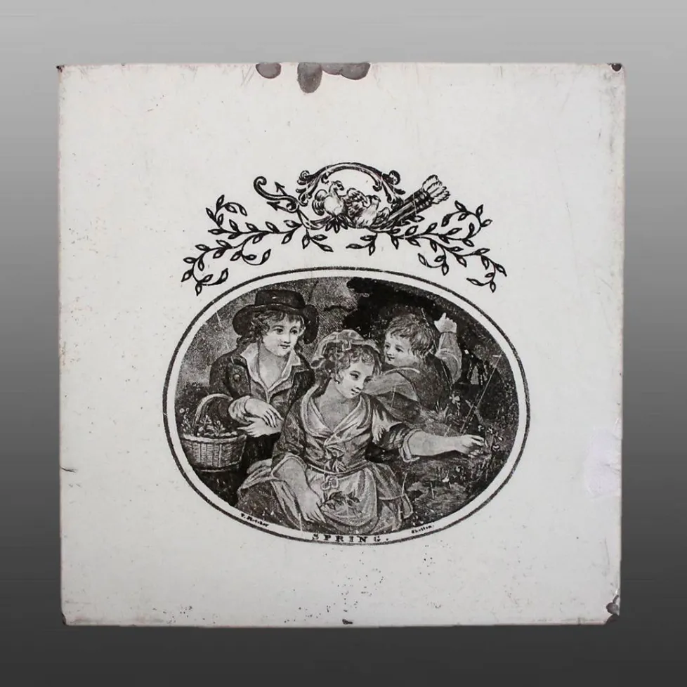 An earthenware black printed tile with the pattern Spring signed T. Fletcher Shelton. Made in Staffordshire and printed by the specialist printer Thoms Fletcher. The subject of the print is taken from Temple of Taste, No. 2, published in January, 1793 by Charles Taylor, No. 10 Holborn, London.BACK TO CATALOG INDEX