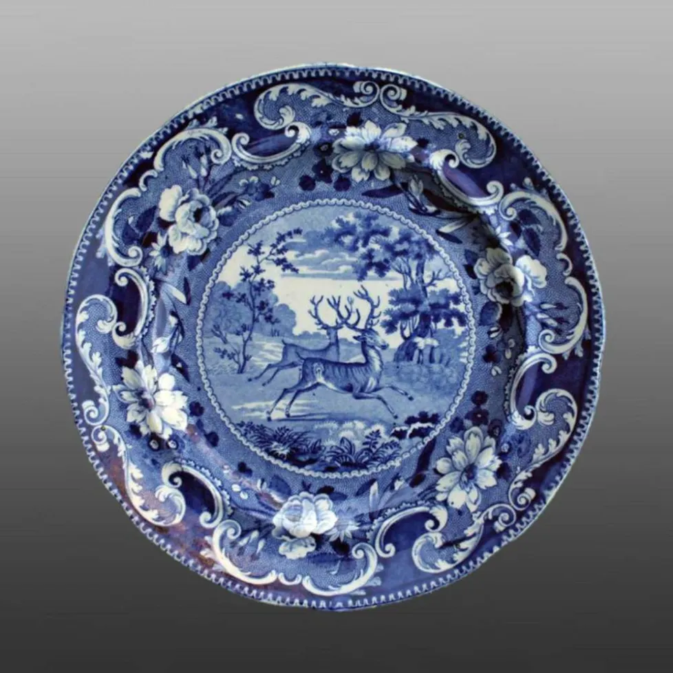 An earthenware plate printed in blue with the pattern known as Two Stags.  The source engraving is from Recreations in Natural History or Popular Sketches of British Quadrupeds drawn by L. Clennell in 1815.