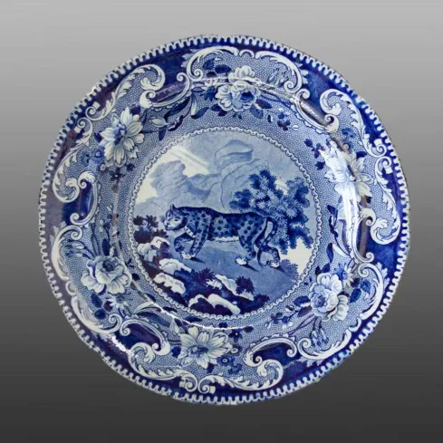 An earthenware plate printed in blue with the Leopard pattern. The source print is shown below.