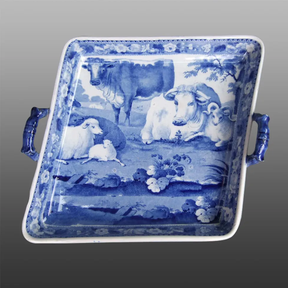 An earthenware handled pickle set with four removable dishes printed in blue in a pattern from the Domestic Cattle series attributed to the Careys based on a documented example with an impressed CAREYS mark.BACK TO CATALOG INDEX
