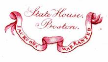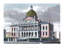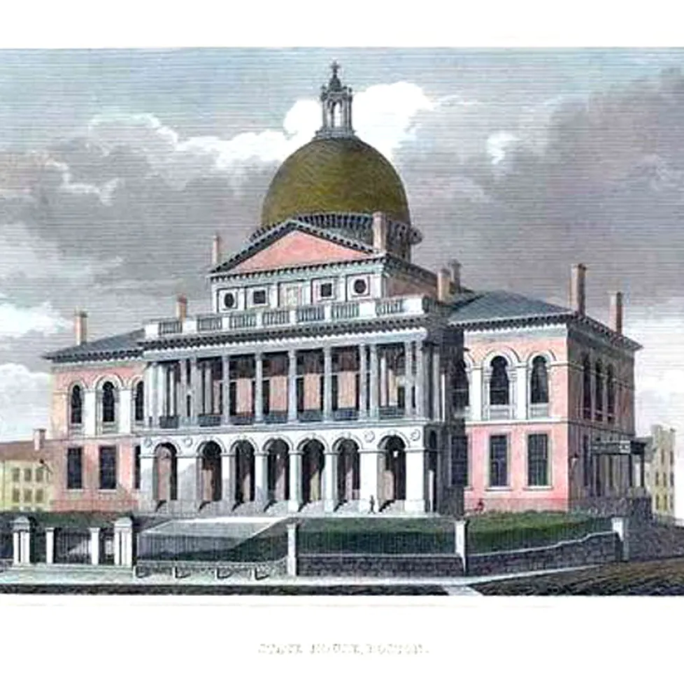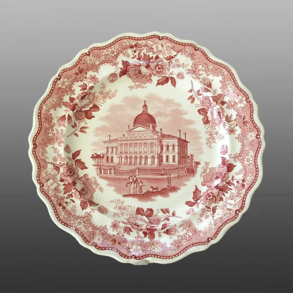 An earthenware plate in the gadroon shape, printed in pink with Boston State House from the American Scenery Series. The border, extending into the well of the plate, features six sprays of roses enclosed within a stippled field scattered with fine, smaller flowers, a beaded band and a white margin.BACK TO CATALOG INDEX