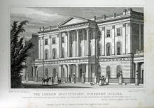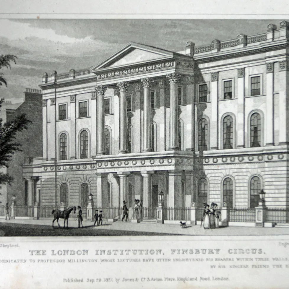 Title: The London Institution, Finsbury Circus Artist: Shepherd, ThomasEngraver / Plate Maker: Deeble, WilliamSize: 5.75" x 3.5"Print Date: 1827The London Institution was founded in 1806, "To promote the Diffusion of Science, Literature and The Arts." Its first home was No. 8 Old Jewry in the City of London, but by 1812 it was in need of larger premises and so moved to a more spacious house a few hundred yards away in Kings Arms Yard, Coleman Street. This again, soon proved inadequate for the Institution's needs and it was decided to move to purpose built accommodation in Finsbury Circus. This was designed by William Brooks and built by Thomas Cubit, work started in 1815, and the building was opened April 21st. 1819. It contained amongst other amenities, a Library, Reading Rooms, a Science and Chemistry Laboratory and a Lecture Hall which could accommodate some seven hundred and fifty persons. By the early 1900's large sums of money were being expended on repairs to the building and it was heavily re- mortgaged, inevitably, in 1912 the Institution closed. However, in 1917, the refurbished building opened as the University of London School of Oriental Studies. The Institution's Library of over 100,000 books had been divided between the British Museum and the University, the Guildhall Library receiving the many London topographical books. In 1933, the School moved to a site near the British museum in Bloomsbury and the Institution building was demolished in 1936.