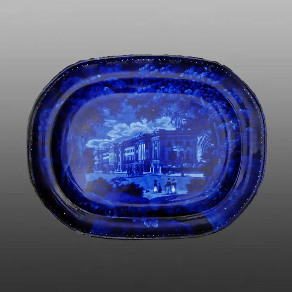 An earthenware platter printed in dark blue with a named view titled Cornwall Terrace, Regent's Park. London.  The source print for this pattern is shown below.