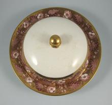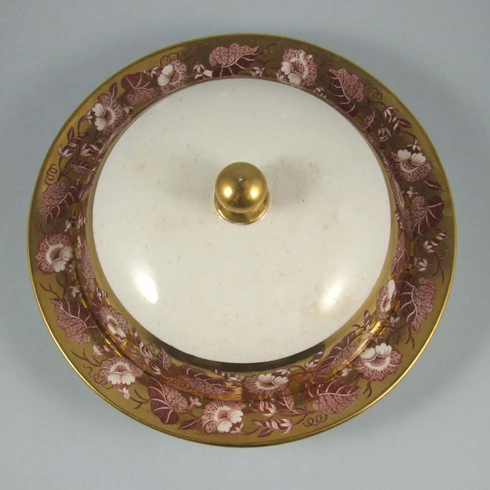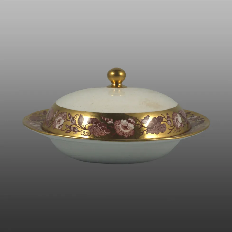 Porcelain decorated in pattern number 2436, printed in brown over a gold panel.  Convolvulus border from the Pluck and Dust Printed Series.  Printed mark Spode in brown on underside of cover, base unmarked.  Print reference number P.525 from Drakard, David and Holdway, Paul. Spode Transfer Printed Ware, 1784-1833. Woodbridge, Suffolk, Antique Collector's Club, Inc., 2002.