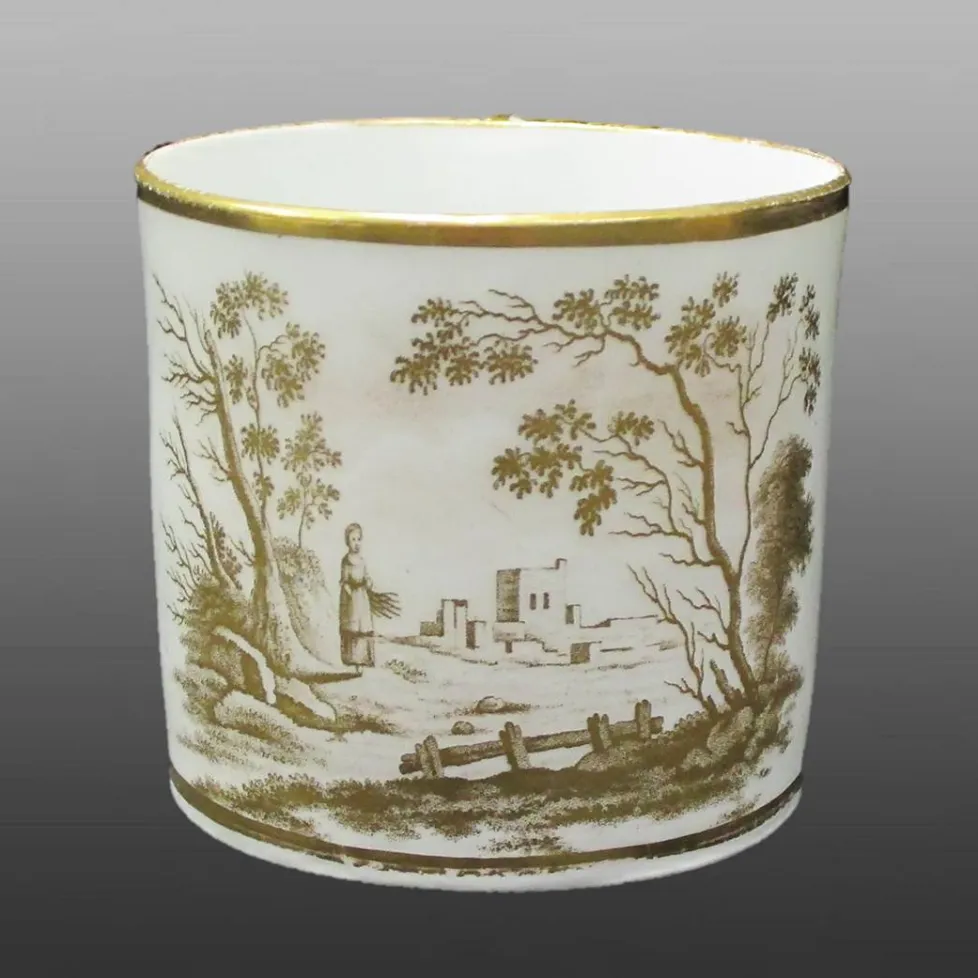 Hard paste porcelain coffee can, decorated with a wide band of blue ground with gilt hand-painted scrolling foliage and on the front with a bat printed decoration in gold, pattern 846.  The print depicts a woman with a bundle of sticks in a rural landscape and is taken from The Ladies Amusement by Robert Sayer.  The piece is unmarked but the gold bat-print and the