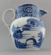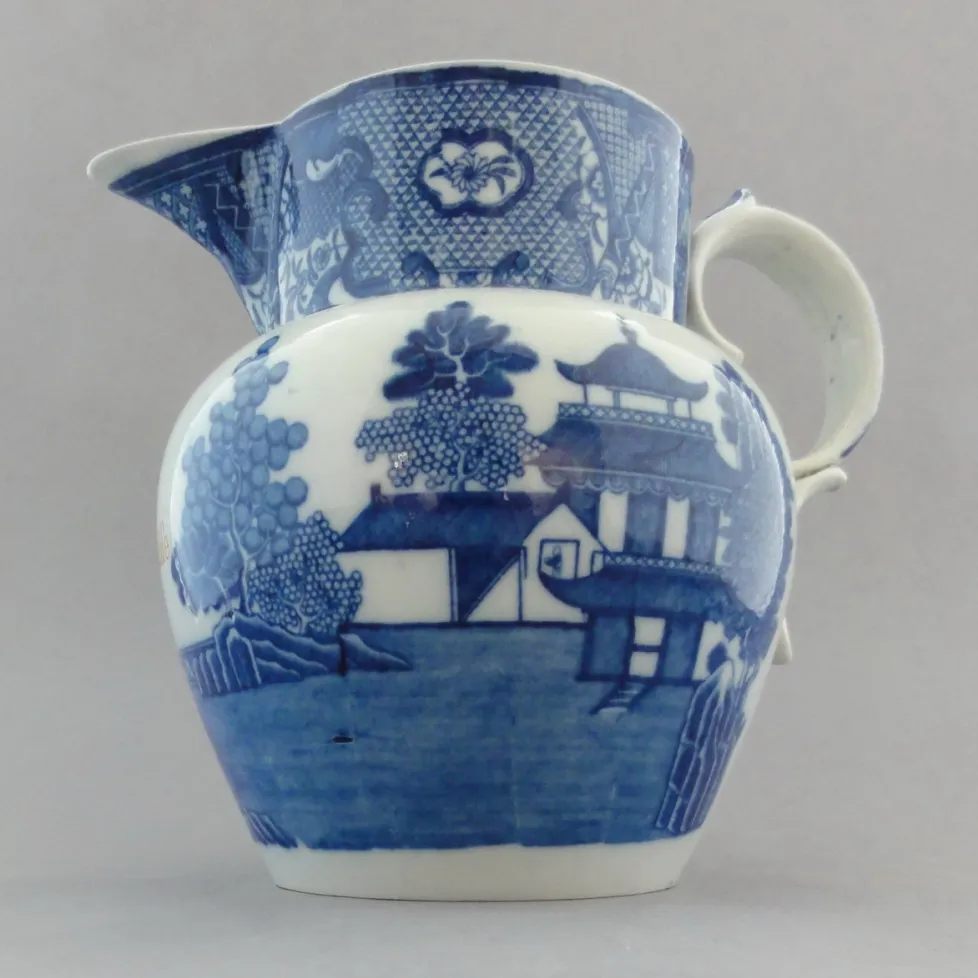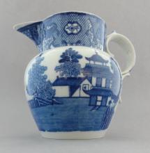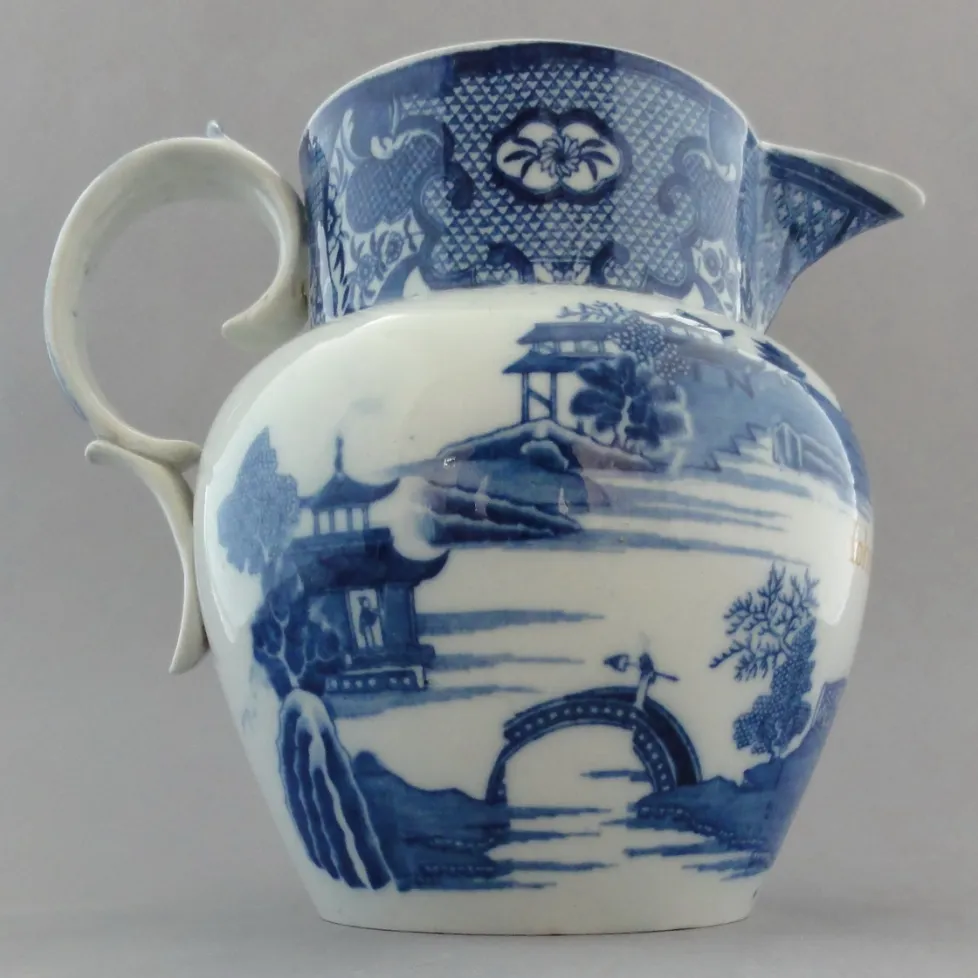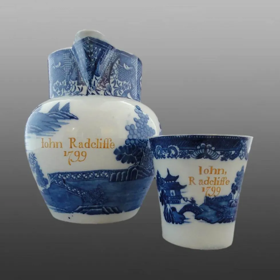 A pearlware commemorative jug and matching beaker printed underglaze in blue with the Rocket pattern. Hand painted in ochre is the name "John Radcliffe" accompanied with the date "1799". The exterior border design made up of geometric shapes and symbols and the interior border consisting of a variation of the butterfly design, distinguish this Rocket pattern from the more traditional one with its bell pattern border. This is an extremely rare example of a pair of commemorative items that would have been presented to John Radcliffe at the same time. The fact that they have both survived for well over two hundred years is extraordinary. The beaker is 3.5 inches high. The name John Radcliffe and the date 1799 probably refers to John Radcliffe of Stonebreak, merchant (1756-1840) and early Saddleworth industrialist. John Radcliffe was an original subscriber and on the committee of the Huddersfield Narrow Canal Company which arrived at Wool Road, Dobcross in 1799. It is possible that the date on the jug and accompanying beaker correspond to the date of the completion of the canal at Wool Road, Dobcross. When James Farrar sold the Manor of Saddleworth in 1791, John Radcliffe assumed the duties of Chairman, Treasurer and Secretary, keeping the minutes of 32 subscribers intending to purchase the Manorial Rights of Saddleworth for their farms and tennant-held lands. The project was part of a larger endeavor culminating with the completion of the Standedge Canal Tunnel which opened in 1811.