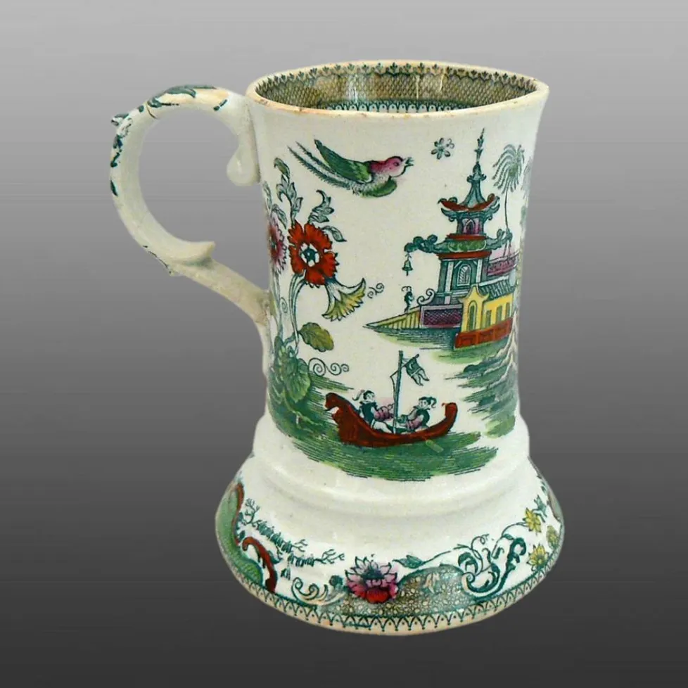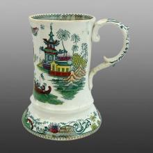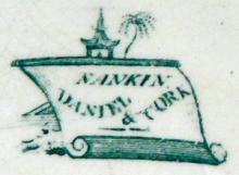 An earthenware mug printed in green with the named pattern Nankin (see the mark). The printed pattern was also painted underglaze. It was produced by Daniel & Cork, a very short lived partnership, in Burslem. The dimensions of the mug are not known.BACK TO CATALOG INDEX