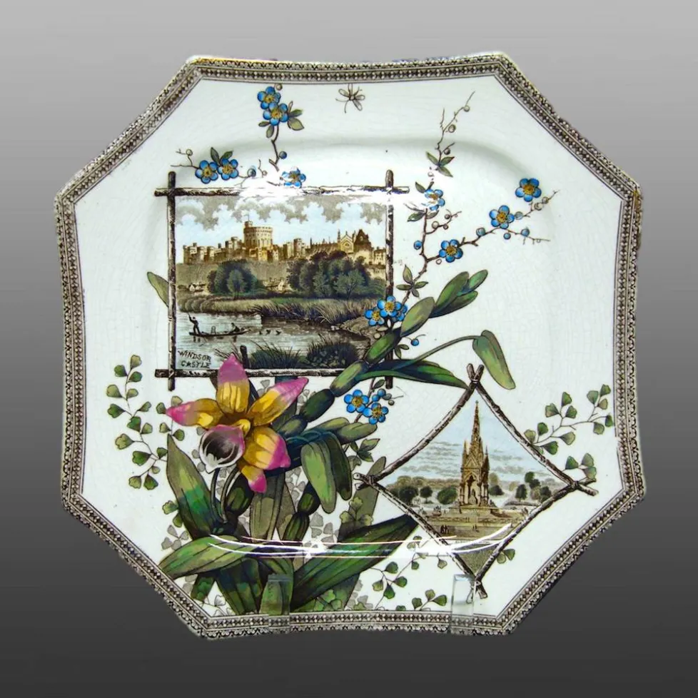 This large aesthetic movement earthenware plate is printed in dark brown with under glaze color painting in shades of fuchsia or red, golden yellow, green, and blue.   The pattern features exotic blooming orchids and wildflowers mixed with maiden hair fern fronds and two cartouches; one of Windsor Castle and another of the Albert Memorial.Windsor Castle is in Windsor in the English county of