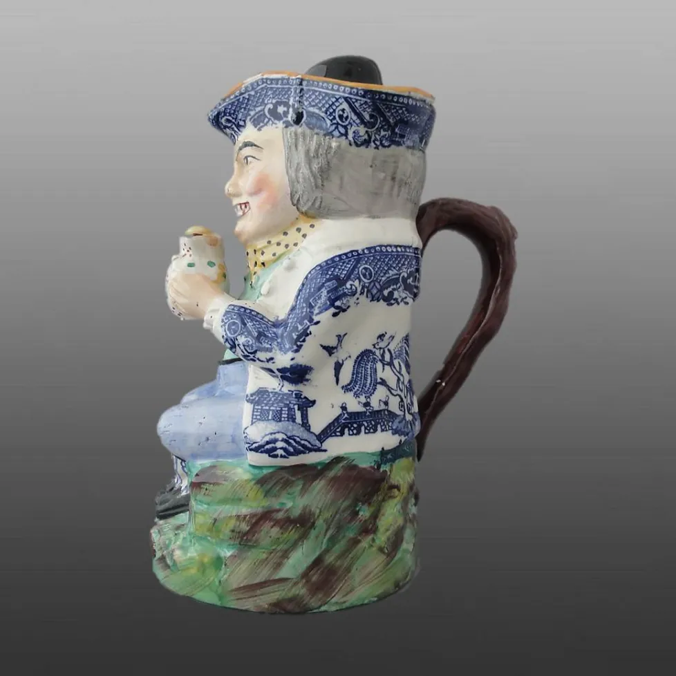 Shown here are three examples of the Toby mug in different sizes and a smaller Snuff Taker mug. All are printed in blue with the Standard Willow pattern.