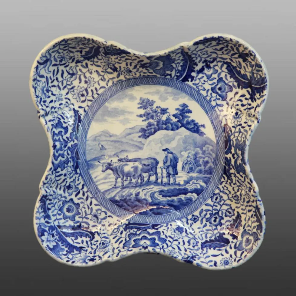 A quadrafoil earthenware dessert dish printed in blue with a pattern from the Durham Ox Series known as The Drover.BACK TO CATALOG INDEX