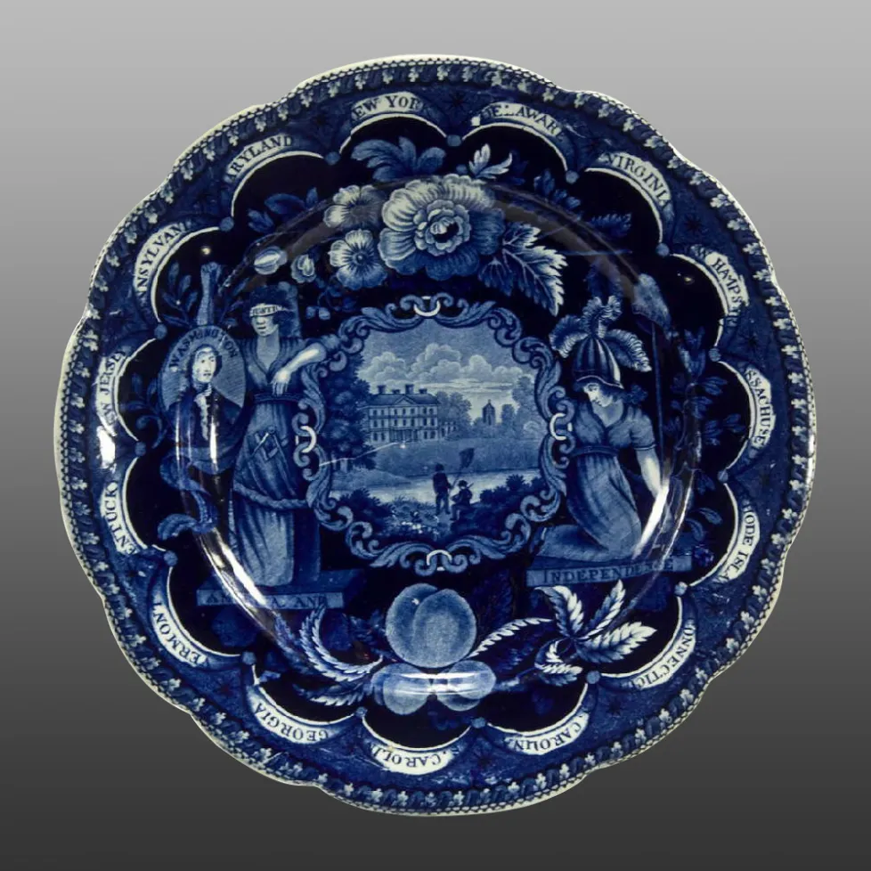 The view printed on this large earthenware dinner plate only appears on a plate and similarly sized soup bowl. The more common name used for this series is America and Independence, due to those words appearing on the plate. This is No. 3 in Arman's numbering system.The central pattern on this example is taken from the source print shown below. Prior to discovery of the