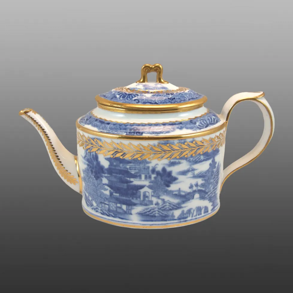 A hybrid hard paste porcelain plain oval shape teapot by Wolfe, Mason and Lucock, Liverpool decorated printed in blue with the Shuttered Windows pattern and having additional gilding. Not marked.