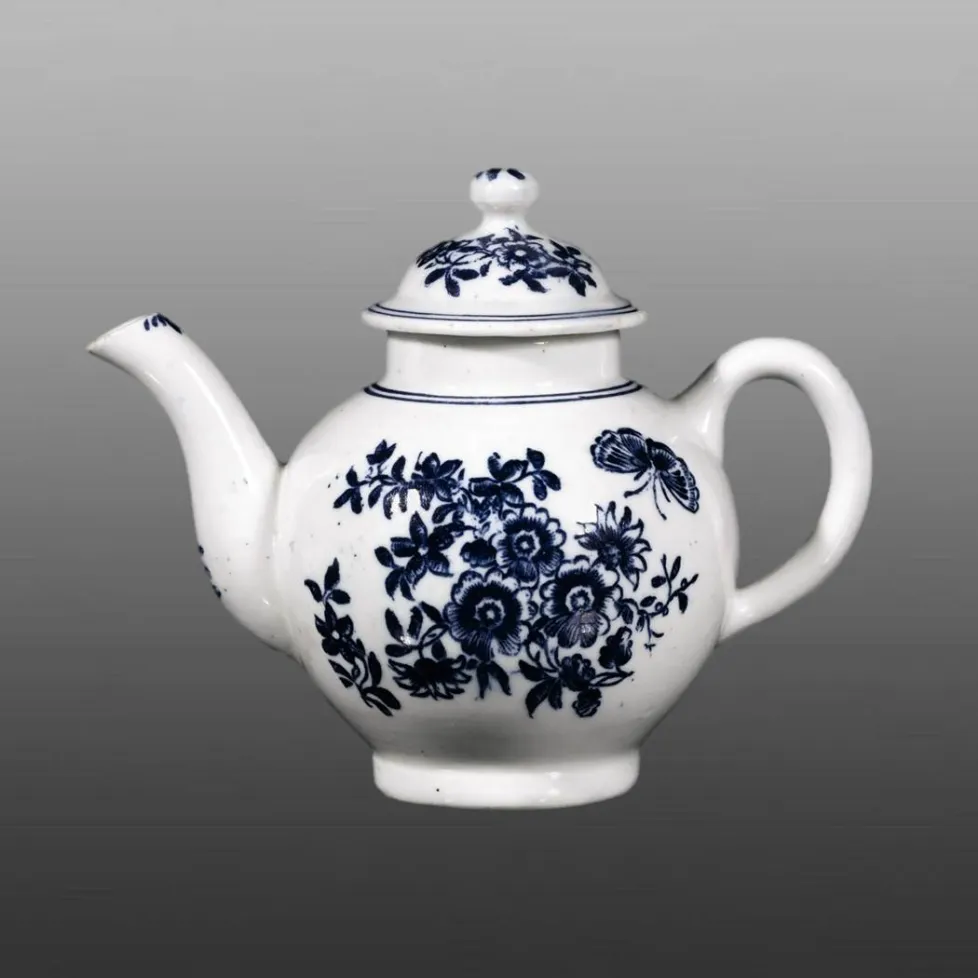 This Lowestoft miniature teapot is printed with the Three Flowers pattern. This pattern was popular on full-sized wares made at the Worcester, Caughley and Lowestoft factories. It became a popular design for Lowestoft miniature wares during the later period of the factory.BACK TO CATALOG INDEX