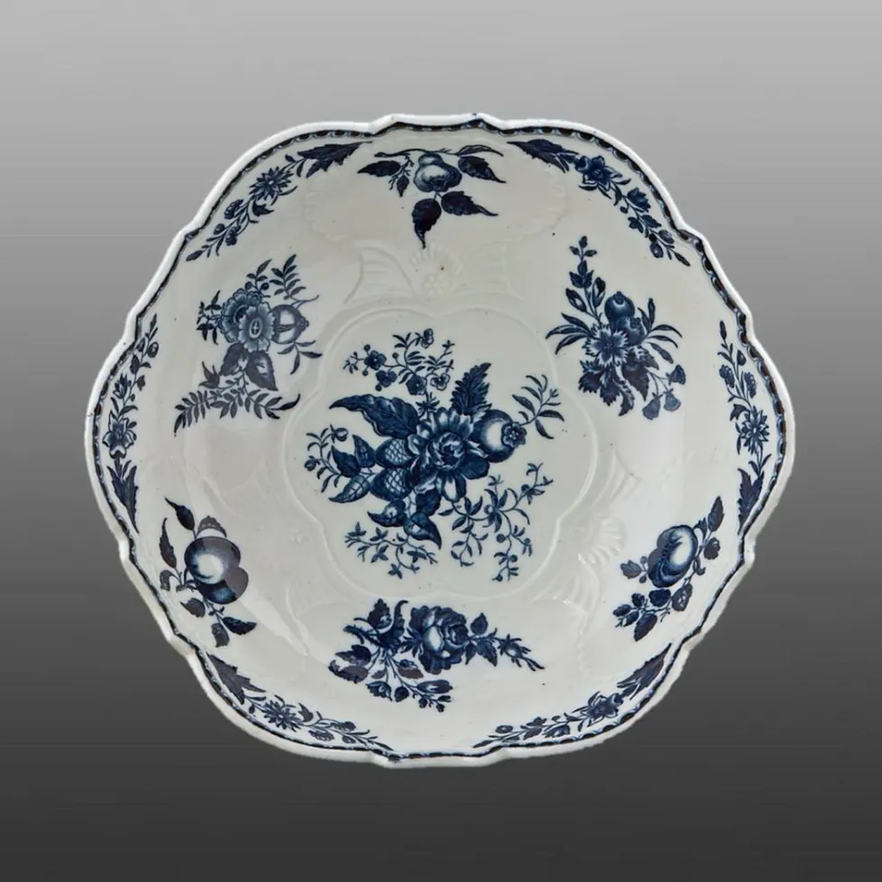 This Caughley salad bowl is very similar in shape to examples made at the Worcester factory.  The inner surface has molded decoration and it is printed with the Pine Cone pattern and a variety of subsidiary prints, some of which were also used with other patterns. The Pine Cone was also a very popular print at Worcester.  More rarely salad bowls of this type decorated with the Pine Cone were produced at the Lowestoft factory.