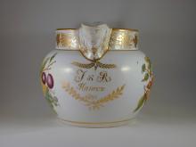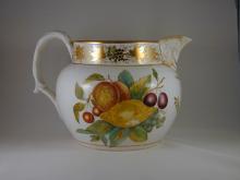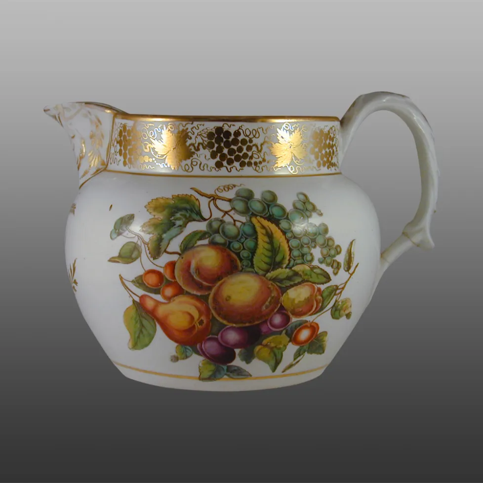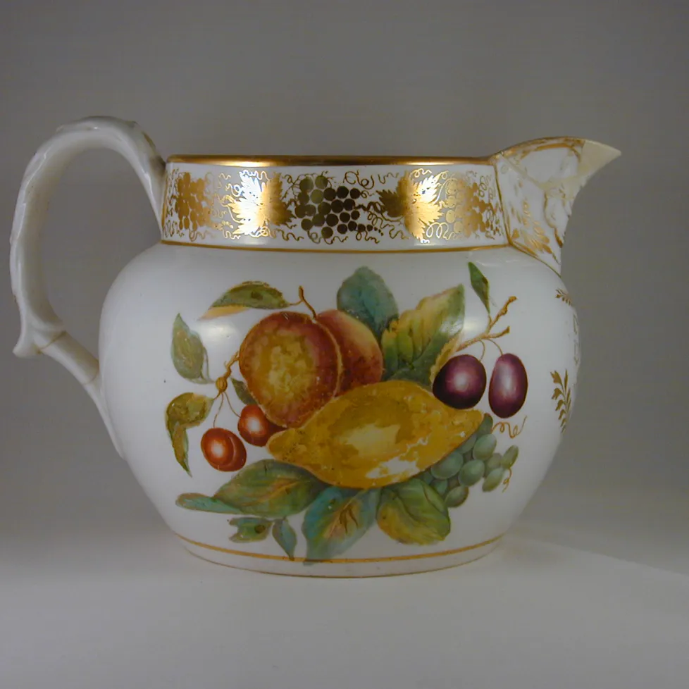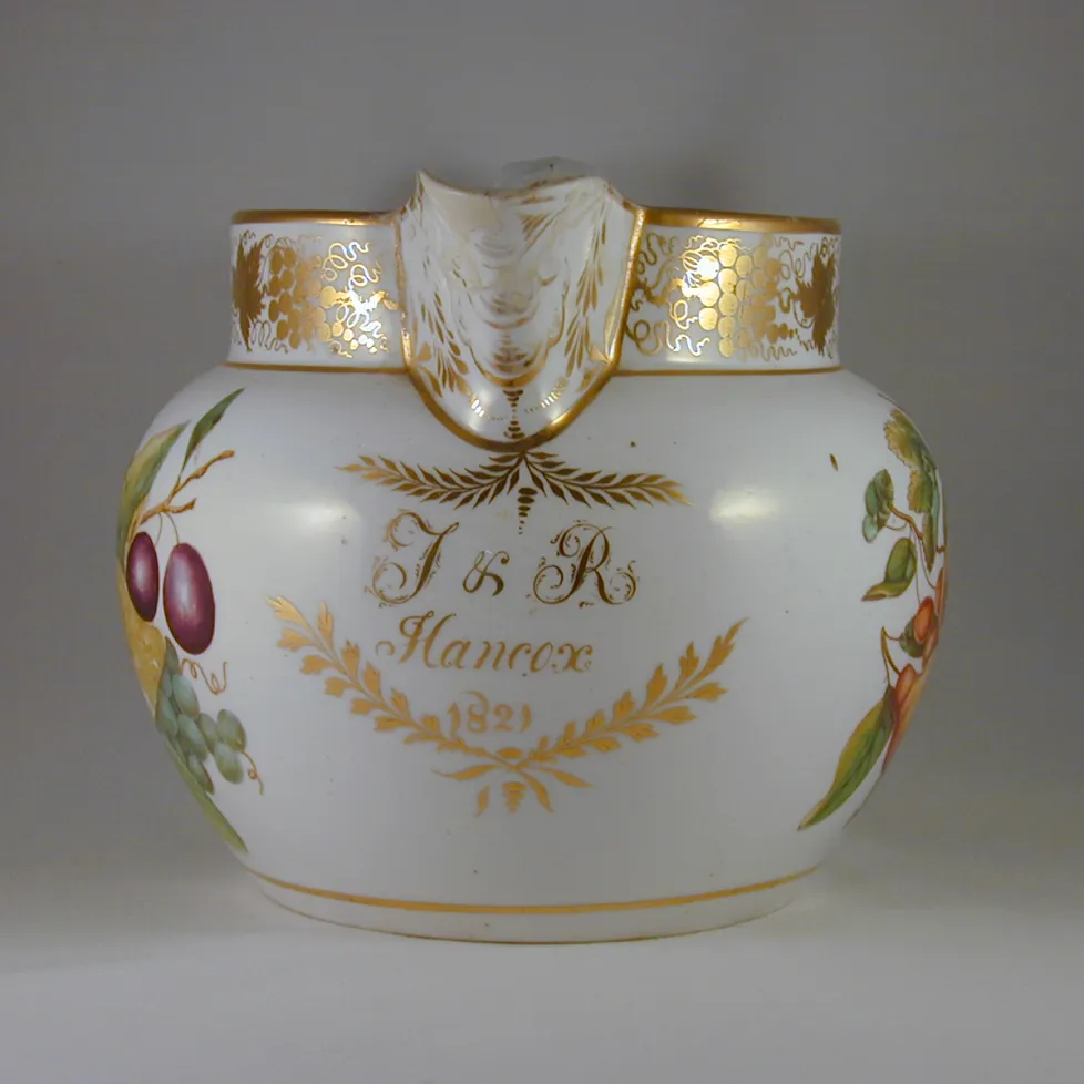 A bone china large jug with moulded loop handle, bat-printed and coloured with a large arrangement of fruit, the neck painted in gold with grapes and vine leaves, inscribed and dated in gold 'T & R Hancox 1821' above a pair of leafy fronds. Unmarked.BACK TO CATALOG INDEX