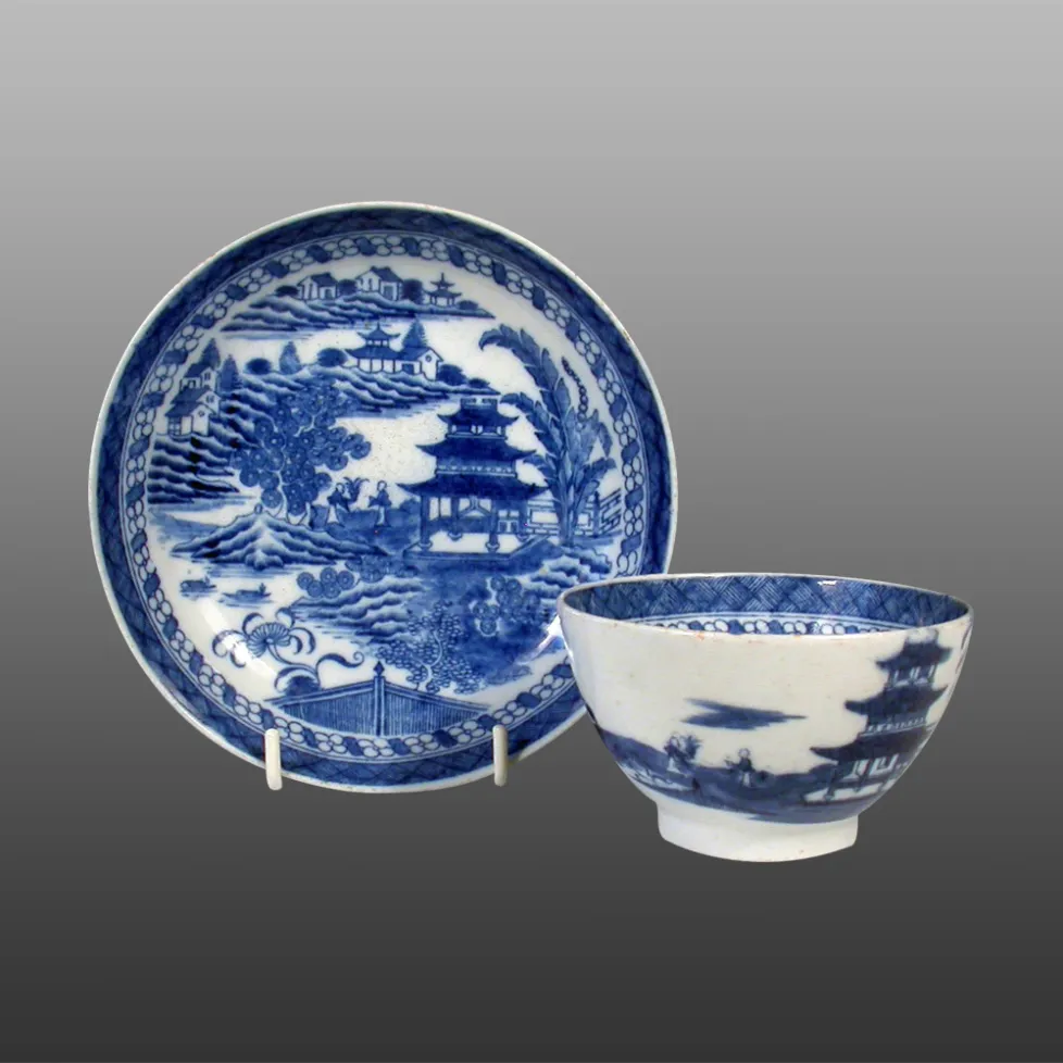 This hybrid-hard-paste teabowl and saucer was made at the Liverpool factory of Wolfe, Mason and Lucock. This factory specalised in making Chinese-looking porcelain to fill the gap in that market caused by the East India Company ceasing to import Chinese porcelain. Despite seeking to emulate Chinese painted patterns, Wolfe & Co used printing for their blue and white patterns.The design on this tea bowl and saucer is called the Gardener Pattern and depicts a garden scene with a large pavilion to the left of which one figure presents a bunch of flowers to another. The factory also produced another version of this pattern with both figures facing the same way and without the floral presentation. The inner border on this latter version has a zigzag appearance and the four flower petals are replaced by rectangular shapes. This variation is closer to the Chinese original. The Coalport factory also produced a hand-painted version of it.