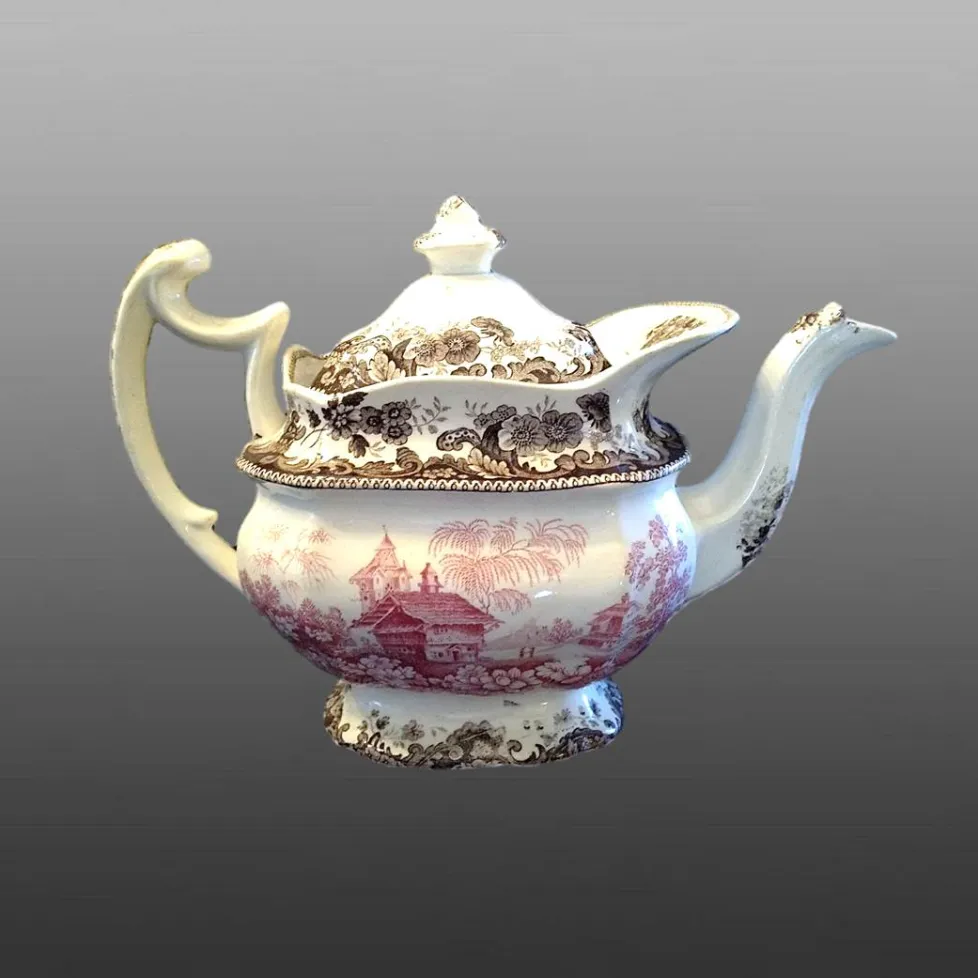 An earthenware teapot with the central pattern printed in pink with the Swiss Chalet pattern and and a floral and scroll border printed in brown top and bottom . This teapot is also known with the same pattern printed in pink and the border printed in black.BACK TO CATALOG INDEX