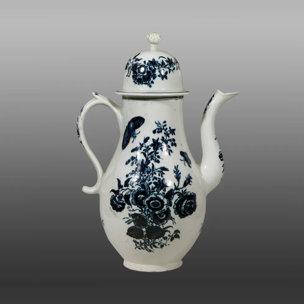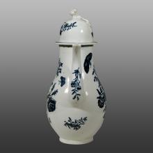 This Lowestoft coffee pot is printed with the Three Flowers pattern copied from Worcester.  The base also bears a copy of the Worcester crescent mark.The pot and lid have simple two-line painted borders.