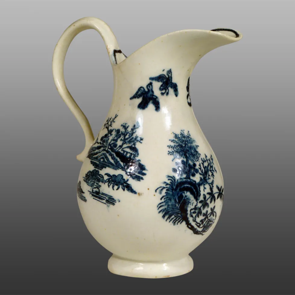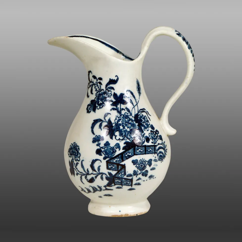This Lowestoft jug is printed with the Fence pattern.  This popular design was copied from Worcester.