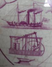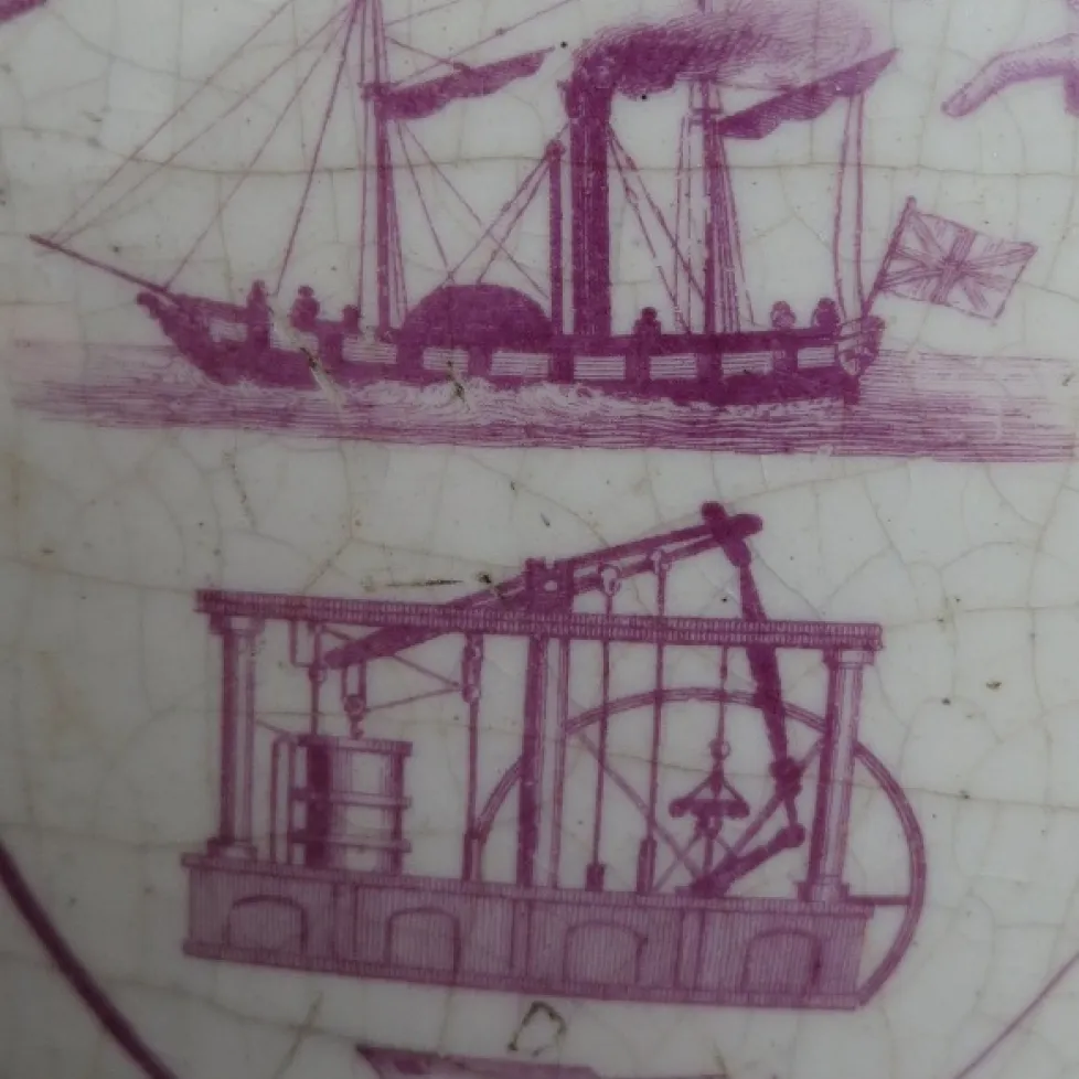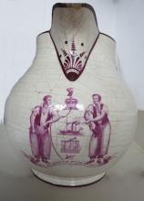 Earthenware jug printed with the fictive arms of 'The Society of Masters and Journeymen Engine, Machine and Millwright Smiths of Liverpool'. The main print is in reverse, note the motto below the shield is back to front. This may indicate that an engraving made for a book or for printing on paper has been used.BACK TO CATALOG INDEX