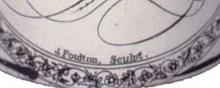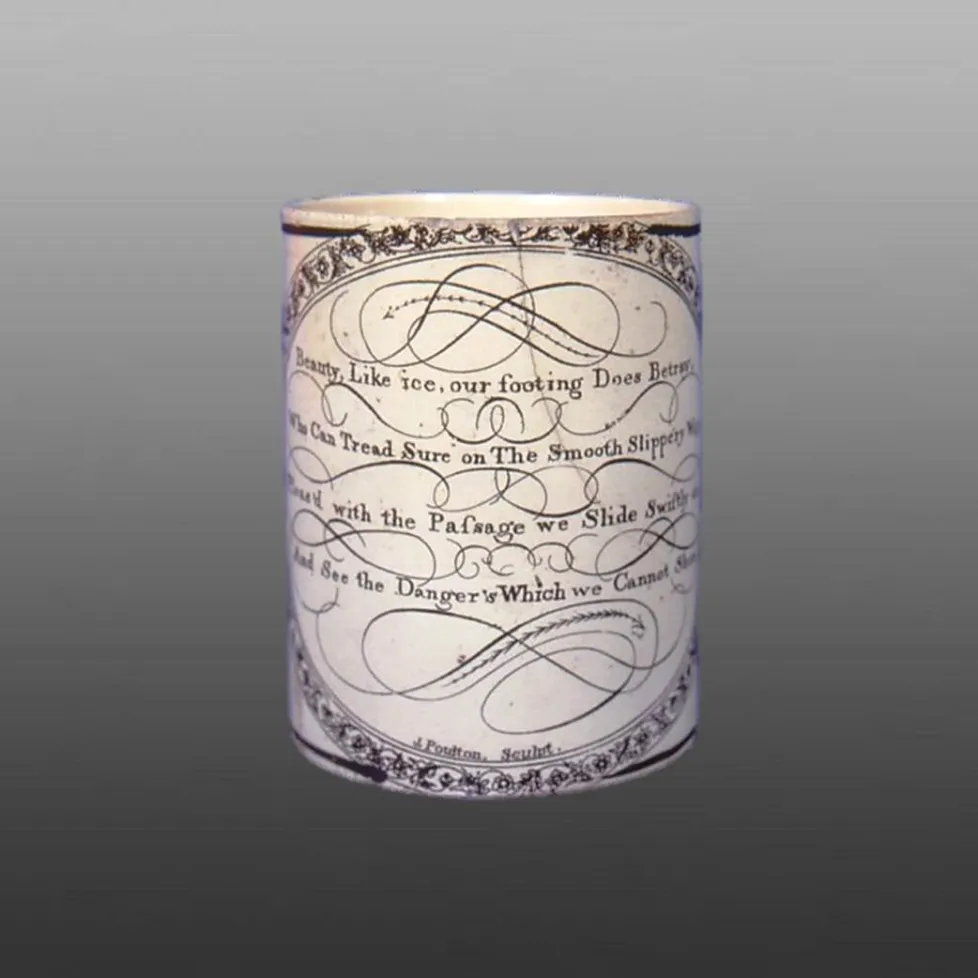 Mug, creamware with black print of a verse within an oval cartouche. The verse by the English poet John Dryden (1631-1700) reads,Beauty, like ice, our footing does betray;Who can tread sure on the smooth, slippery way:Pleased with the surface, we glide swiftly on,And see the dangers that we cannot shun.The cartouche bleeds off the top and bottom of the mug which suggests it was designed for a larger vessel. At the bottom of the design is the inscription J. Poulton Sculpt. Nothing is known of this engraver. The name Poulton occurs rarely in North Staffordshire records and there is no evidence to relate the name to any aspect of the pottery industry in that area.