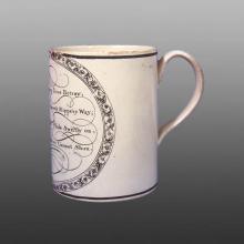 Mug, creamware with black print of a verse within an oval cartouche. The verse by the English poet John Dryden (1631-1700) reads,Beauty, like ice, our footing does betray;Who can tread sure on the smooth, slippery way:Pleased with the surface, we glide swiftly on,And see the dangers that we cannot shun.The cartouche bleeds off the top and bottom of the mug which suggests it was