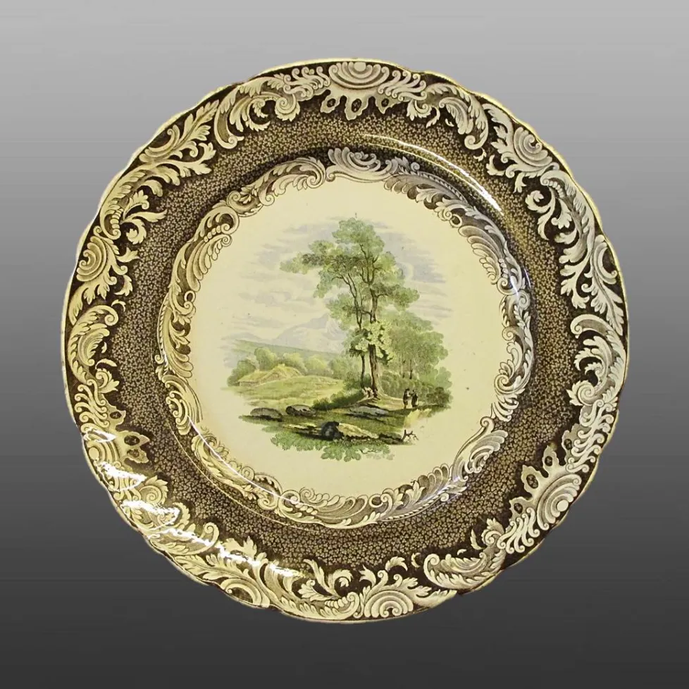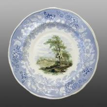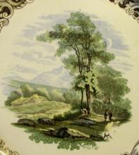 One of two plates from the Acanthus Scrolls Border Series. The center with multi-plate, multicolor transfer printed landscape in green, brown, yellow, and blue. The multicolor print is known on plates with a different border design known to collectors as the Butterfly Border, and examples are recorded with the impressed mark WOOD.BACK TO CATALOG INDEX