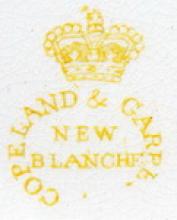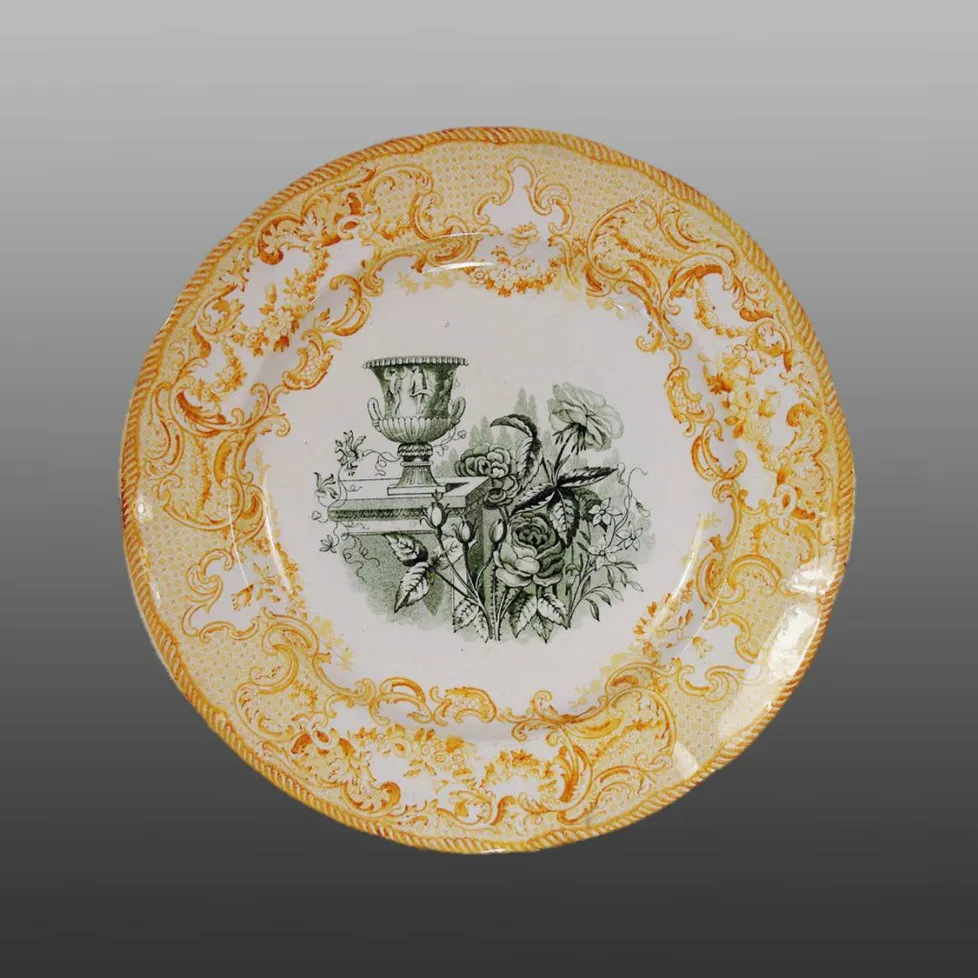 This dinner plate is printed in two colors, the center pattern in green and and wide border in yellow. The pattern name is Antique Vase and is also recorded as pattern No. 618 in the Spode B Pattern Book. The mark was common on white earthenware. The exact size is unknown.