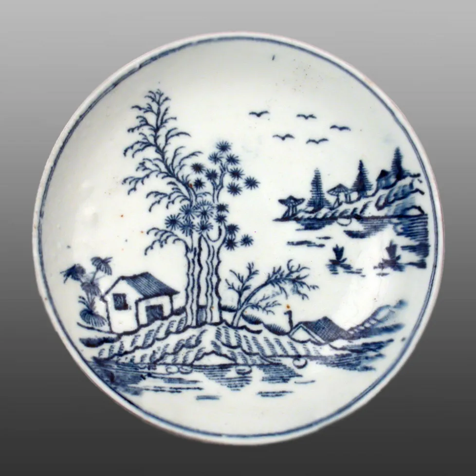 John Howell named this oriental landscape Island with Tall Trees in his review of Lowestoft printed patterns in ECC Transactions 7 (3). At other factories where the design was used, Worcester, Caughley and John Pennington's Liverpool, it is usually referred to as the Rock Strata Island. However, at Worcester and Caughley, the pattern is painted and John Pennington produced both painted and printed versions.BACK TO CATALOG INDEX