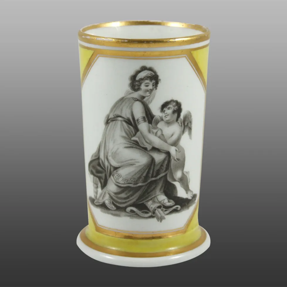 A spill vase, unmarked, bat printed in black with a classical scene and having additional gilded bands and underglaze enameled decoration in bright yellow.BACK TO CATALOG INDEX