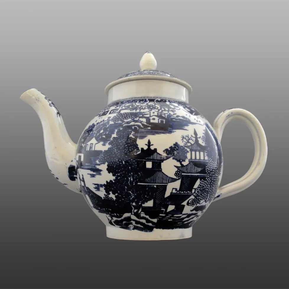 An early pearlware globular shaped teapot printed in dark blue in a line engraved version of the Conversation pattern.  A number of potteries produced the Conversation pattern, and several different border patterns are known. This example employs a Butterfly, sometimes referred to as a Moth border.