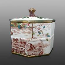 The opposite side features a sporting scene with hounds at the hunt with a fleeing rabbit.  A castle sits in the landscape with cows grazing near a water pond.