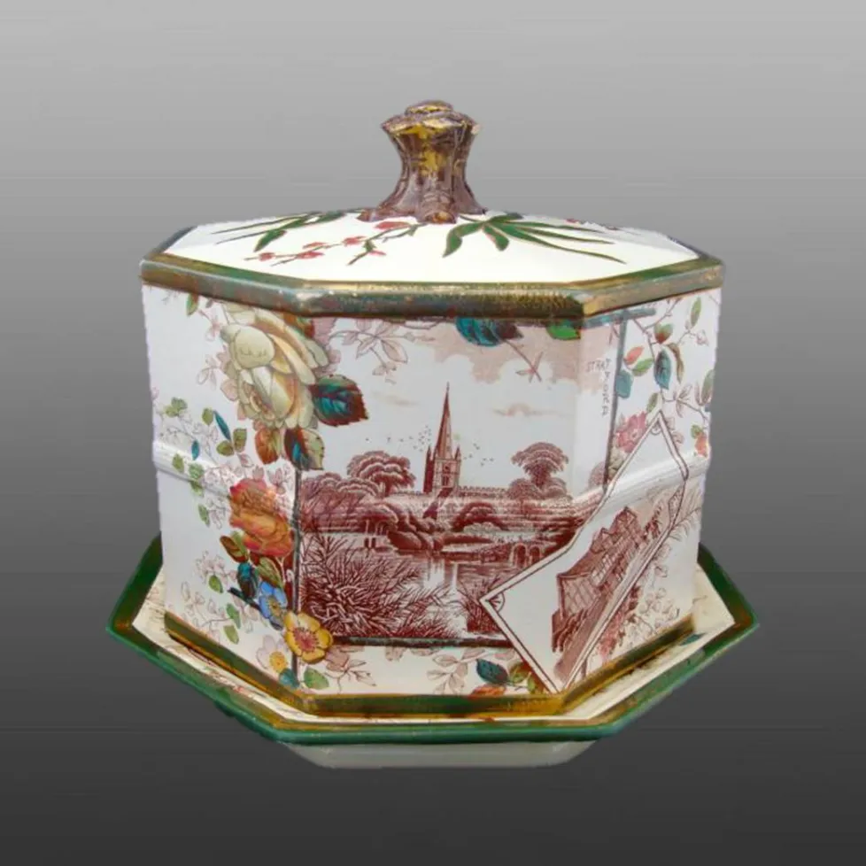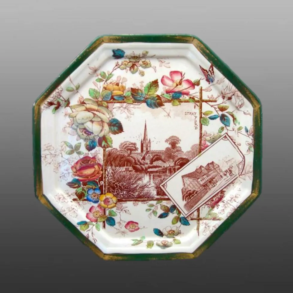 A large octagonal earthenware cheese dome printed in dark brown with underglaze painting in shades of pink, red, green, cobalt blue, golden yellow, turquoise. The edges of the dome and stand are painted in a dark green with touches of gold.  The pattern on the base as well as on the dome features William Shakespeare's house and a larger cartouche with an image of