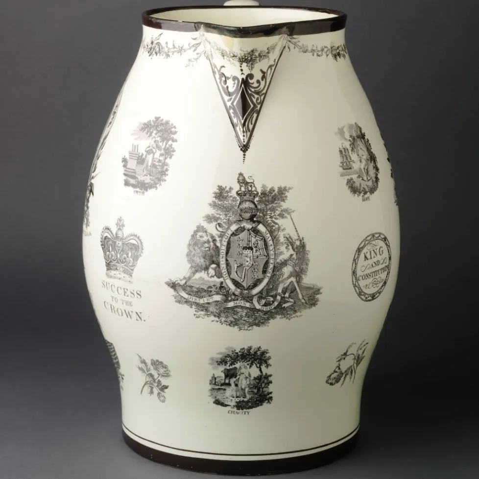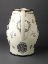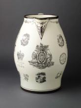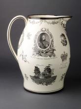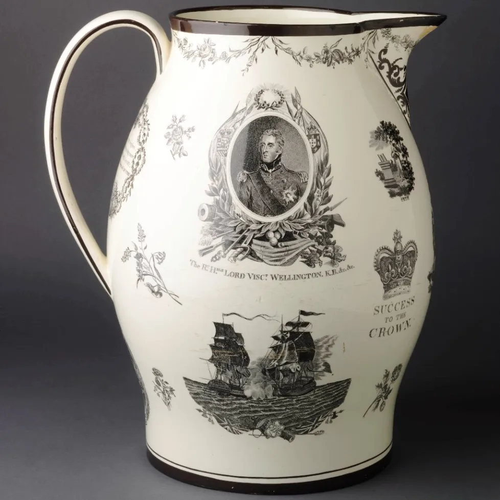 The reverse of the jug has prints including an oval portrait of inscribed "The RT. HBLE. LORD VISCT. WELLINGTON. K.B. &c. &c." supported by naval trophies. Arthur Wellesley was ennobled as Viscount Wellington in 1809 for his successful command of the British Forces in Portugal during the early years of the Peninsular War in which Britain united with Portugal and with Spanish guerrilla forces to defeat the French first in Portugal and then in Spain . This portrait shows Wellington as a young British hero wearing the star of the grand cross of the order of the Bath to which he was admitted in 1803. He continued to rise in the peerage to become the 1st Marquis of Wellington in 1812 and 1st Duke of Wellington in 1814.