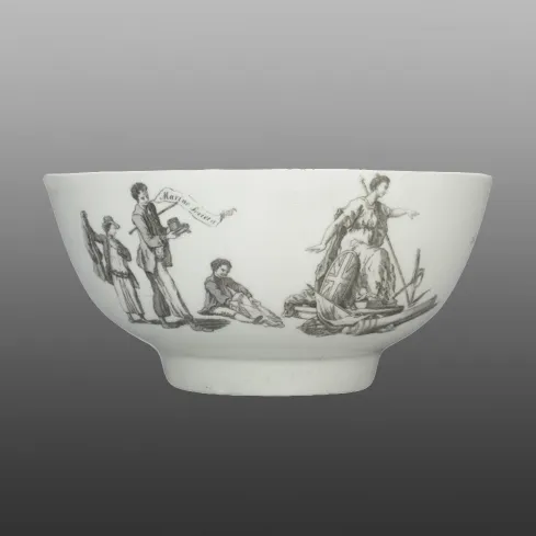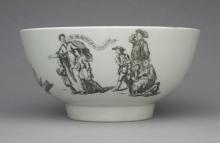 This Worcester porcelain bowl is decorated with a print of Britannia.  To the left of this is a print of three boys who are changing into new clothes.  The tallest of these has a scroll with the words "Marine Society" beside him.  To the right of Britannia is another print, seen below, showing a figure, perhaps symbolic of Charity, leading two small boys.  There