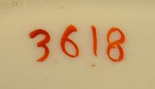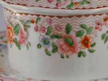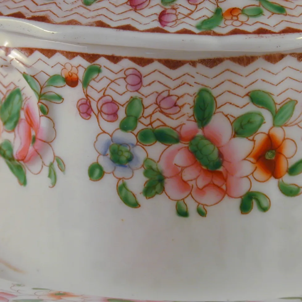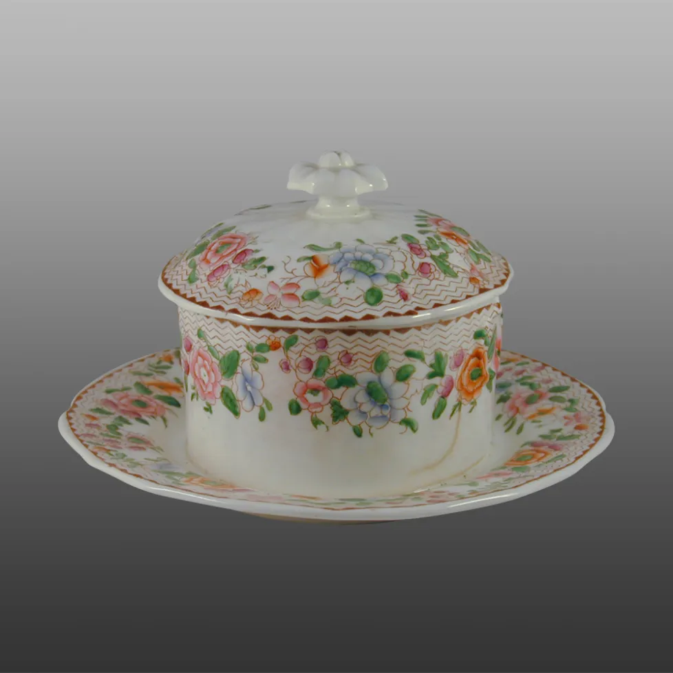A bone china butter tub on a fixed stand, moulded with ring handles and flower-head finial, printed in warm brown and enhanced with enamels with flowers and leaves, pattern 3618.BACK TO CATALOG INDEX