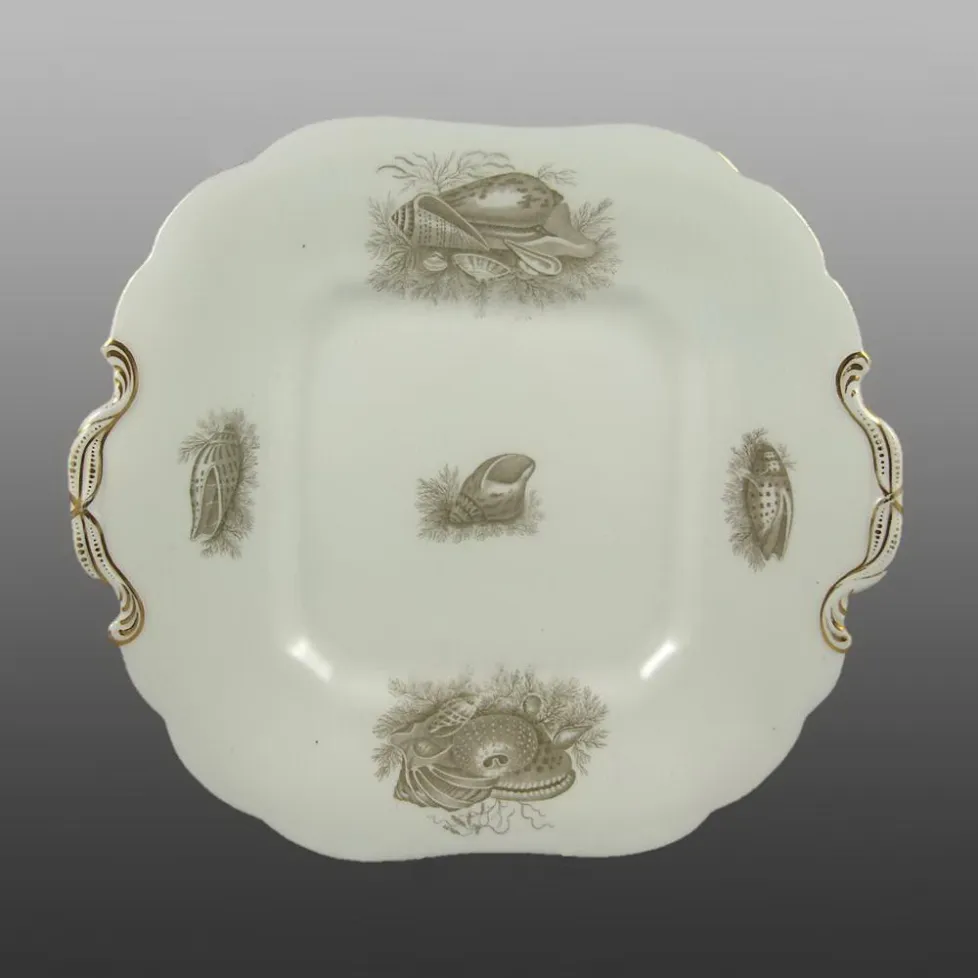 A square handled cake plate bat printed in mid grey with prints of sea shells and seaweed. Additional gilding.BACK TO CATALOG INDEX