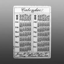 An advertising calendar tile, dated 1898 printed in black. Wedgwood produced these tiles for Jones, McDuffee & Stratton (JMS), a Boston, Massachusetts pottery retailer. The series was produced from 1879 to 1929. The 1898 design was also produced without the calendar, in black. The obverse is a view of the Kings Chapel. Text on obverse lower left corner reads: “King’s Chapel Boston. Built 1686. rebuild 1749." Near the bottom center are the initials “J McD &S." On the lower right corner is the maker's name, “Wedgwood Etruria England." The church is still used today by a congregation Unitarian Christian in theology, Anglican in worship, and Congregational in governance. The church looks much the same today as it did in 1898.JMS was founded by Otis Norcross and in business from 1810 until about 1955. The firm was named for Jerome Jones (joined in 1853), Louis P. McDuffee (1863), and Solomon P. Stratton (1866). JMS sold an extensive line of Wedgwood tiles and plates (reportedly 1100 different views, many of American historical subjects), as well as pottery from other British makers. The patterns were occasionally produced on wares, without the calendar. The tiles are rectangular and vary slightly in size, with a maximum of approximately 4.9 by 3.4 by .3 inches thick. Early examples were decorated in various colors, but by the early 1900s only brown/sepia was used. The first two years of production featured only a calendar. The only production data known is that in 1910, 12,000 tiles were ordered. It is unclear whether the calendar tiles were sold or given away free as advertising, but each tile has either one or two holes at the top, clearly indicating that they were meant for display. “WEDGWOOD ETRURIA ENGLAND." appeared on the edge of all tiles from 1917 to 1929, and at various locations on the front of some earlier tiles. There were 81 known color variations produced during the 52 years of production. There are no documented examples from 1884.
