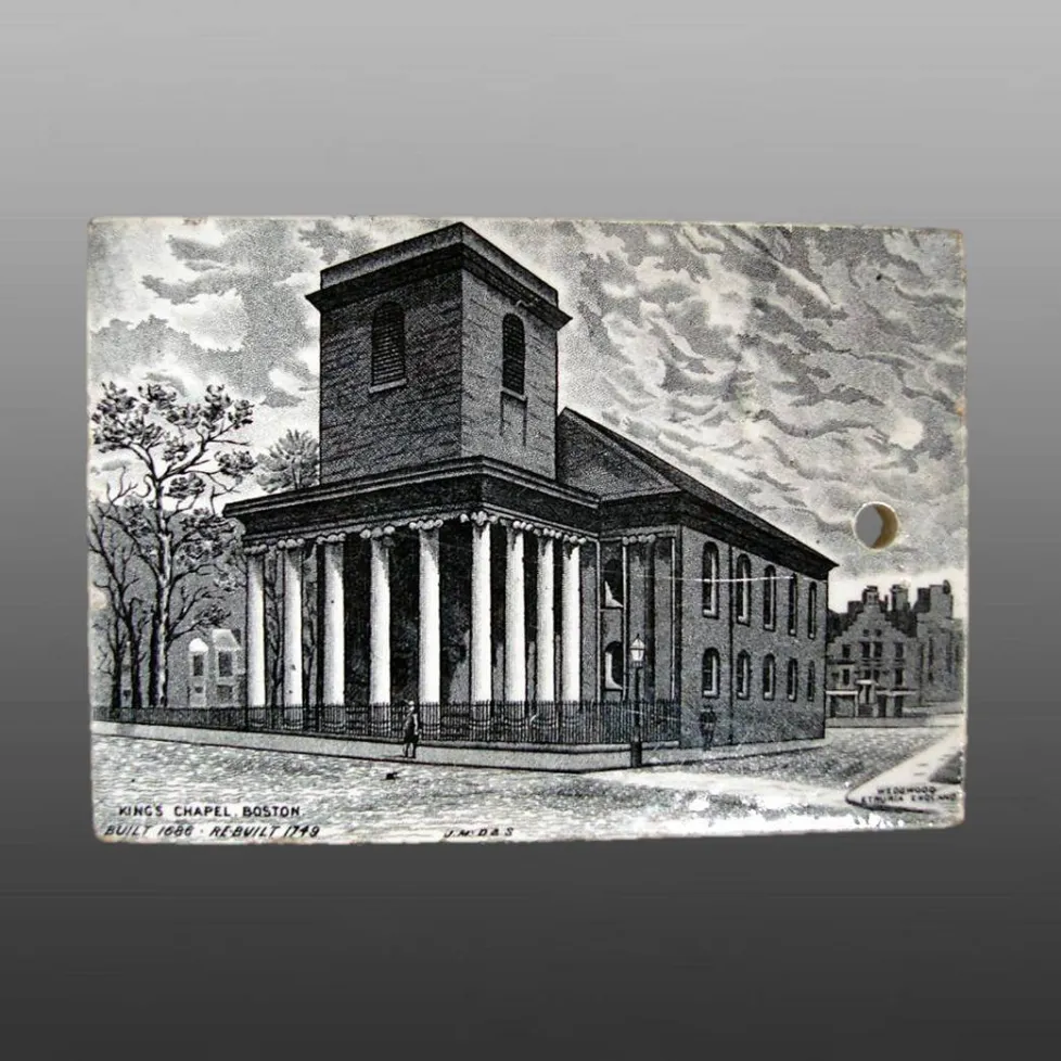 An advertising calendar tile, dated 1898 printed in black. Wedgwood produced these tiles for Jones, McDuffee & Stratton (JMS), a Boston, Massachusetts pottery retailer. The series was produced from 1879 to 1929. The 1898 design was also produced without the calendar, in black. The obverse is a view of the Kings Chapel. Text on obverse lower left corner reads: “King’s Chapel Boston. Built 1686.