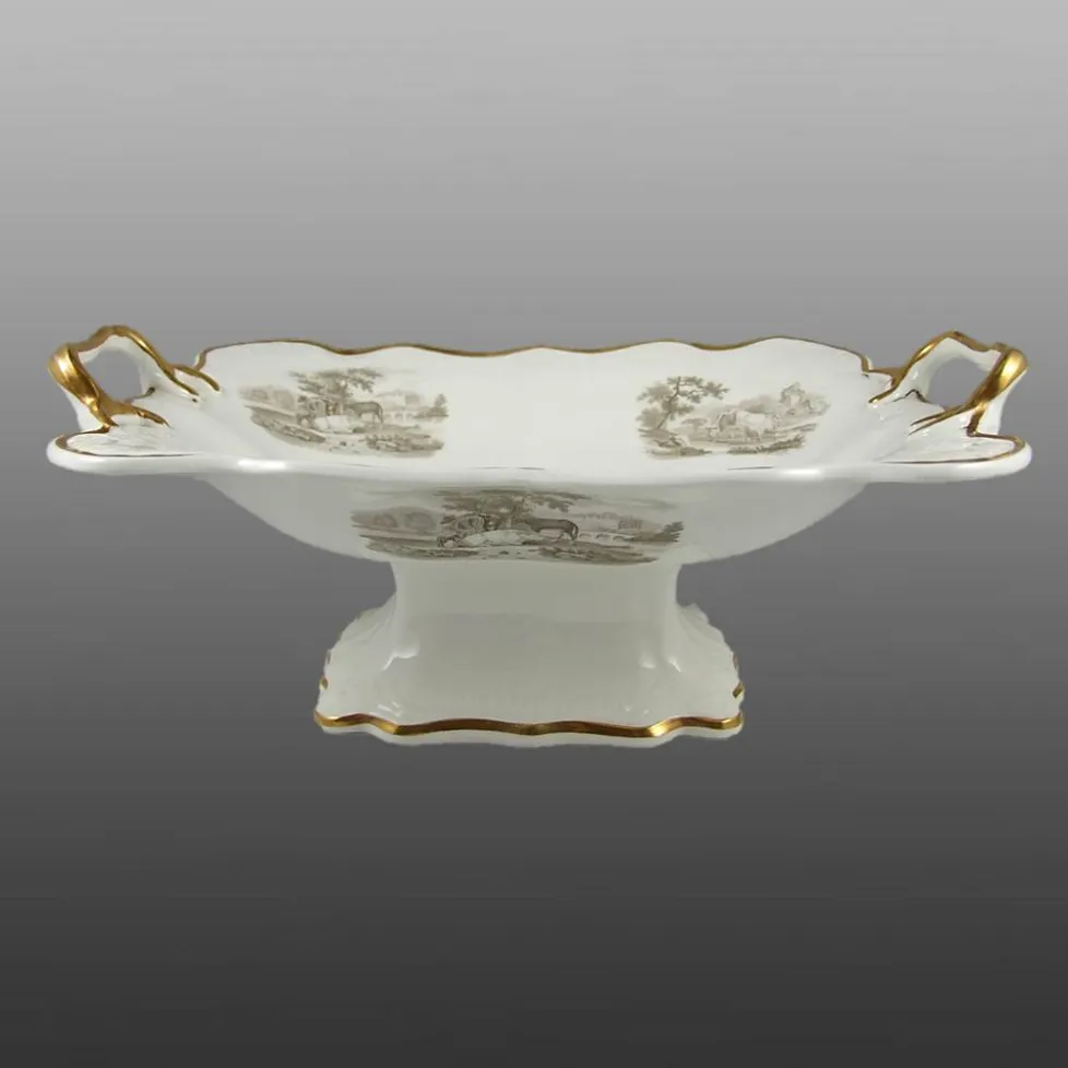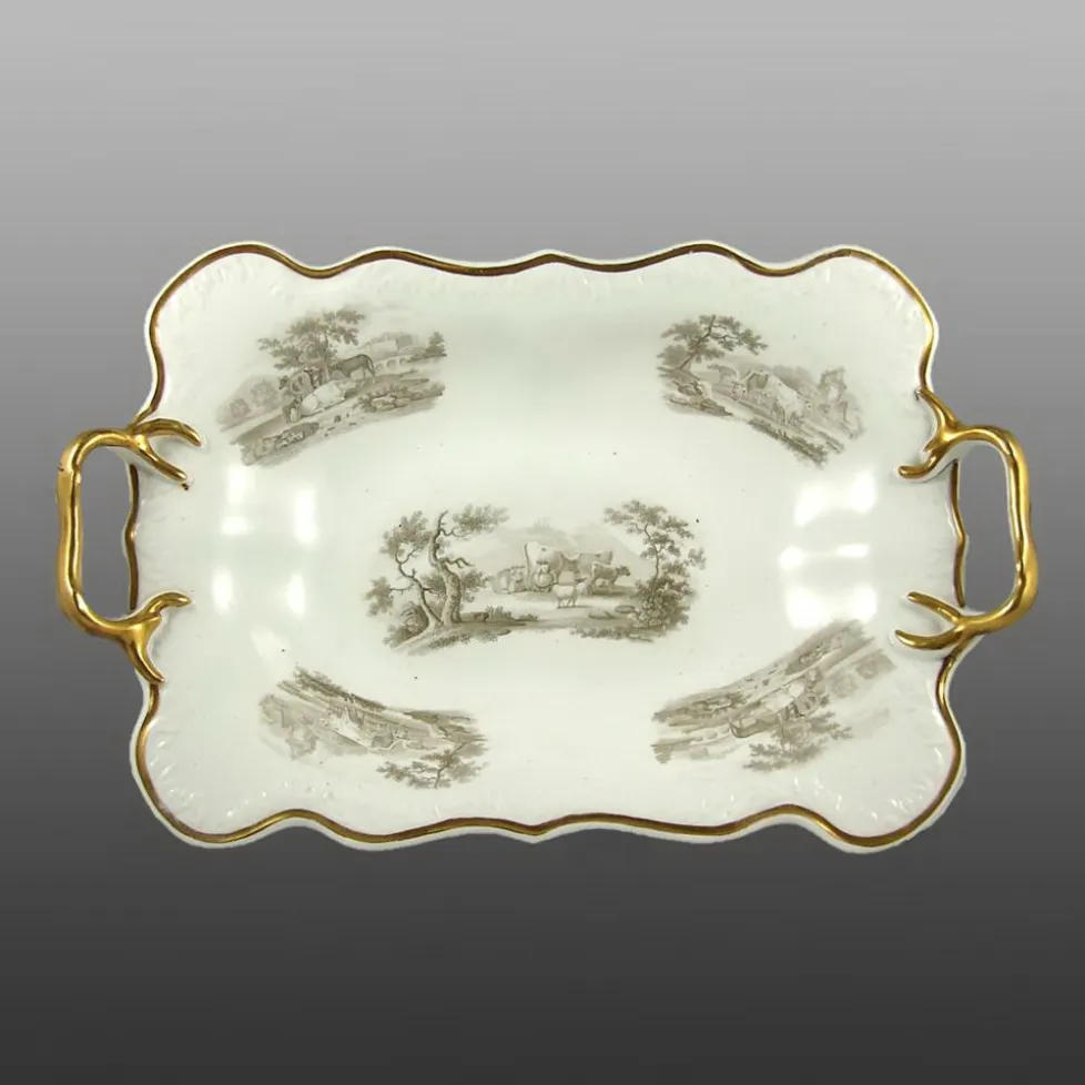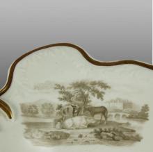 A centrepiece handled tray in Alcock's pattern number 1004, having embossed Melting Snow borders, bat printed in charcoal grey with farm animals and having additional gilding.BACK TO CATALOG INDEX