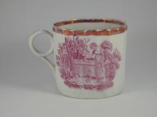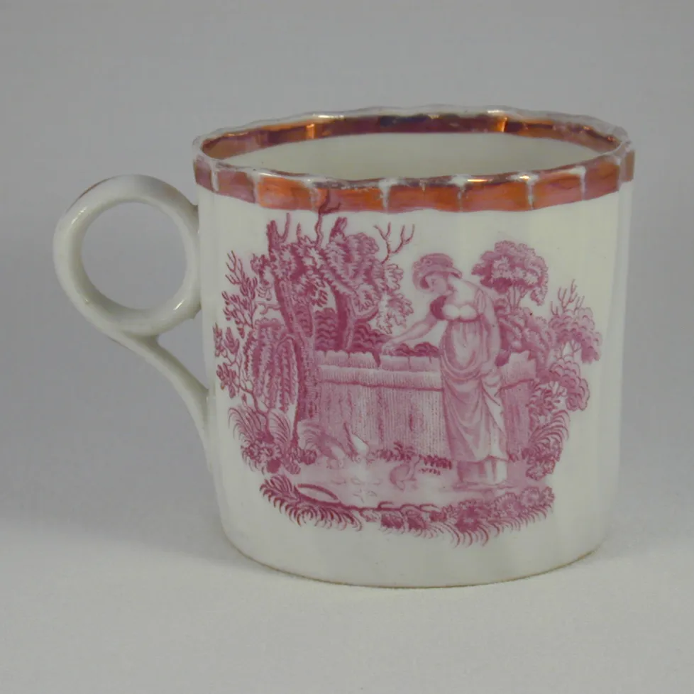 Hard-paste coffee can moulded with spiral flutes, bat-printed in puce with a woman throwing corn to chickens, with a lustre rim, unmarked.BACK TO CATALOG INDEX