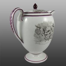 An egg shape coffee pot and cover, unmarked, bat printed in black with print numbers P.414-2 and P.404 on the pot and P.419 and P.420 on the lid from the Animals Series. Additional magenta enamel band decoration. Print reference Drakard, David and Holdway, Paul. Spode Transfer Printed Ware, 1784-1833. Woodbridge, Suffolk, Antique Collector's Club, Inc., 2002.BACK TO CATALOG INDEX