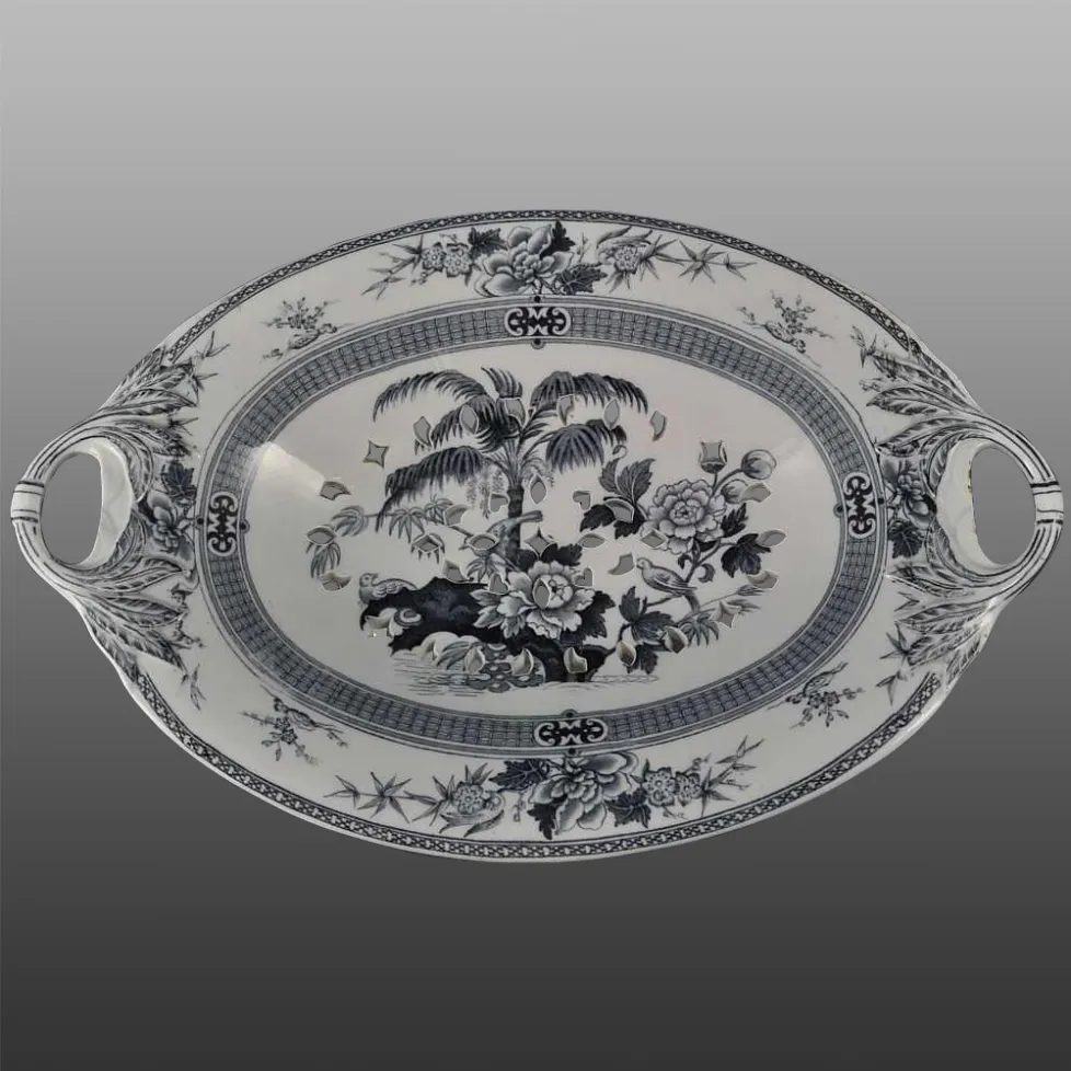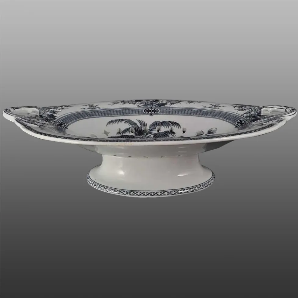 An unusual earthenware colander with molded handles printed in black in the Palm pattern. It probably had an accompanying under tray to collect any liquid passing through the pierced holes. Impressed on the underside is the three letter date code AGZ which dates the piece to 1871.BACK TO CATALOG INDEX