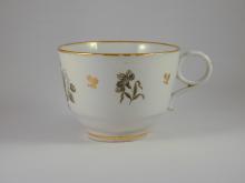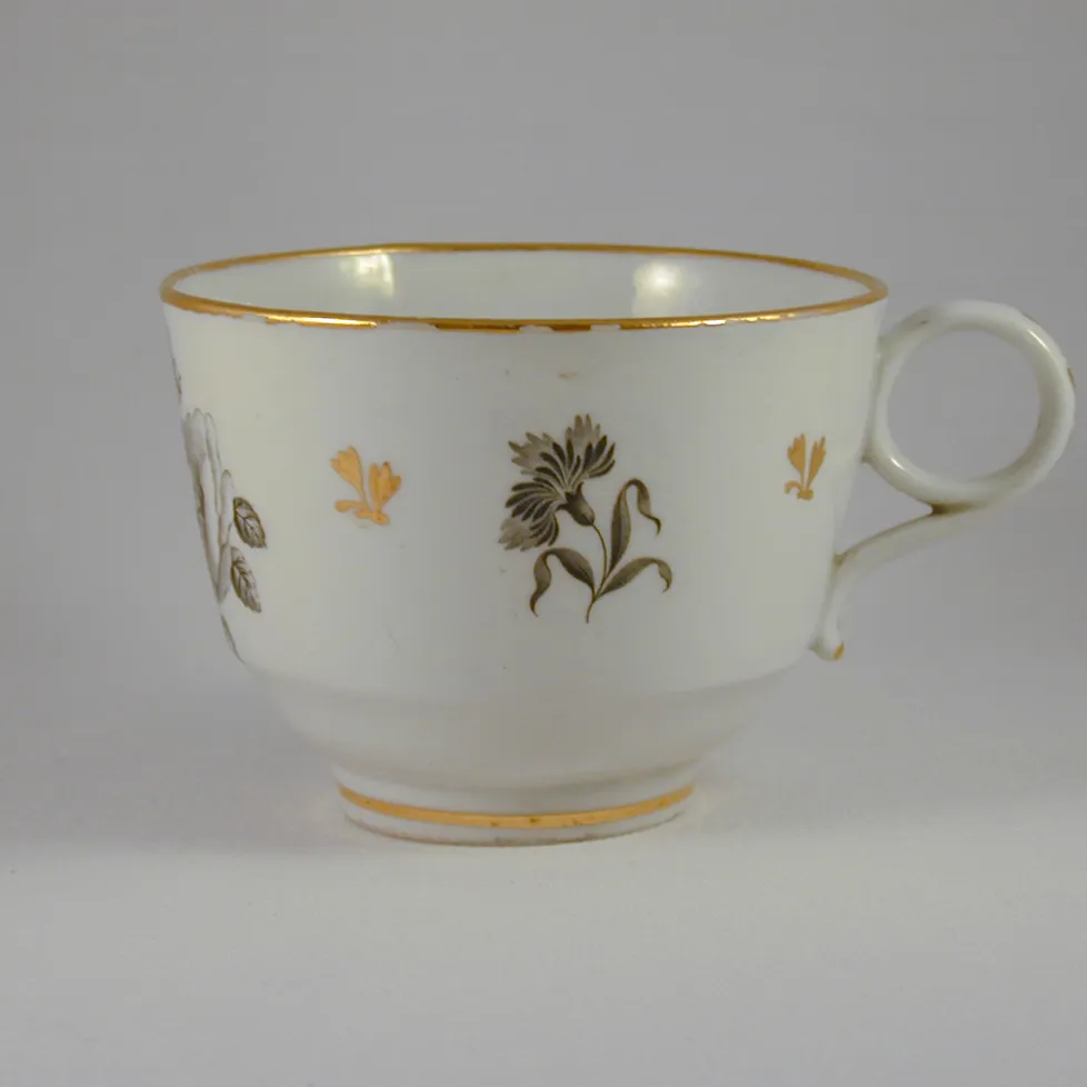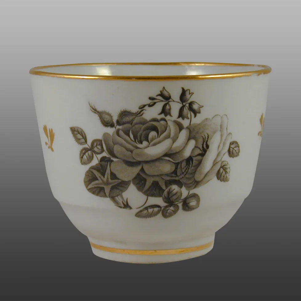 A hard-paste cup bat-printed with a main spray of roses on the front and secondary sprigs of rosebud and a carnation. The cup is incised very faintly with the letter B for Barr.BACK TO CATALOG INDEX
