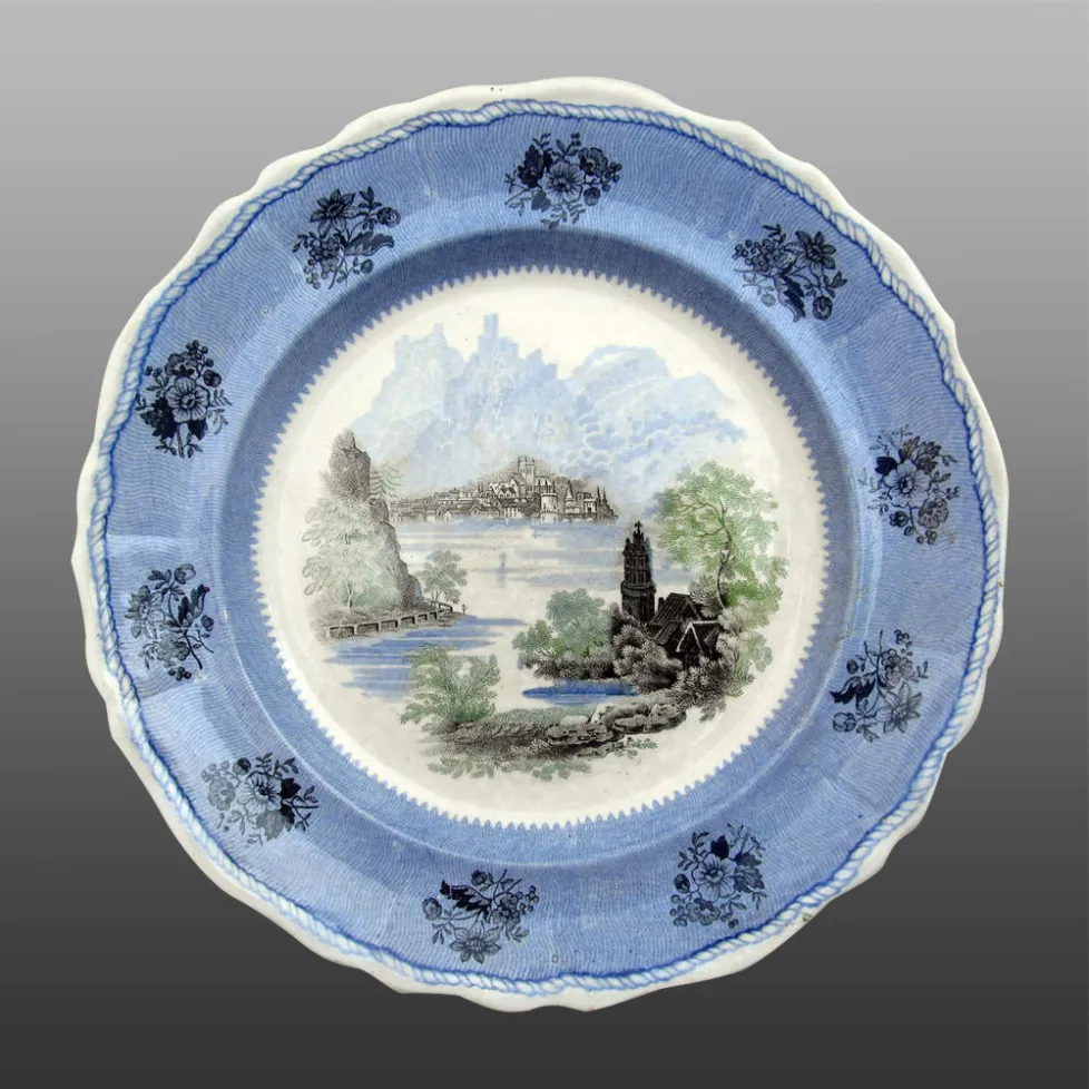 A scalloped earthenware dessert plate, printed underglaze in three colors - blue, green and black - with a Romantic landscape.  It is one of 14 known views used in a series that is known as Rhenish Views.  This example is recorded in the TCC Pattern and Source Print Database as Rhenish Views #05 Variation.  Davenport’s color printing technique is attributed to Jesse Austin; reference