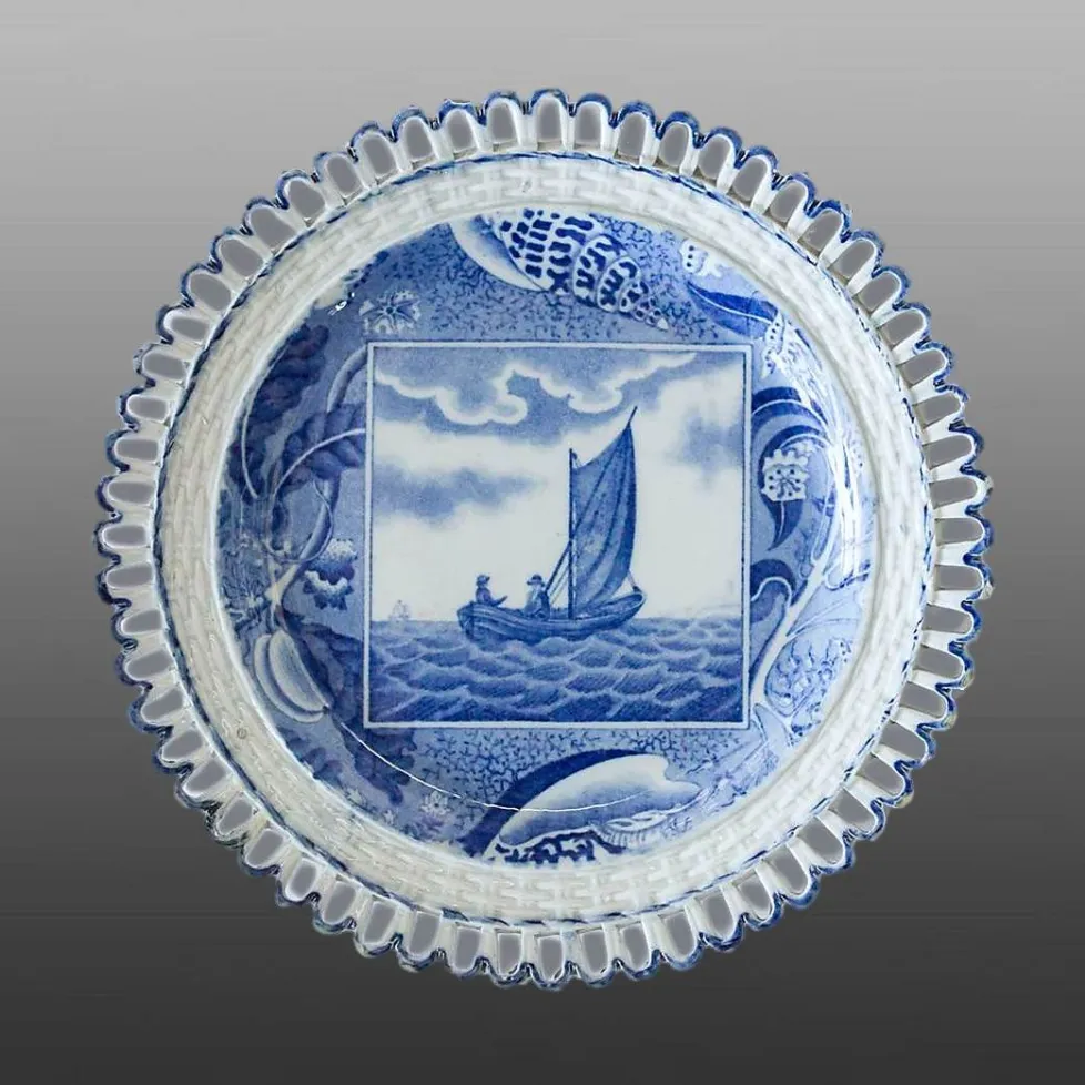 A molded and arcaded earthenware dessert dish printed in blue with a pattern named Fishing Dinghy.BACK TO CATALOG INDEX