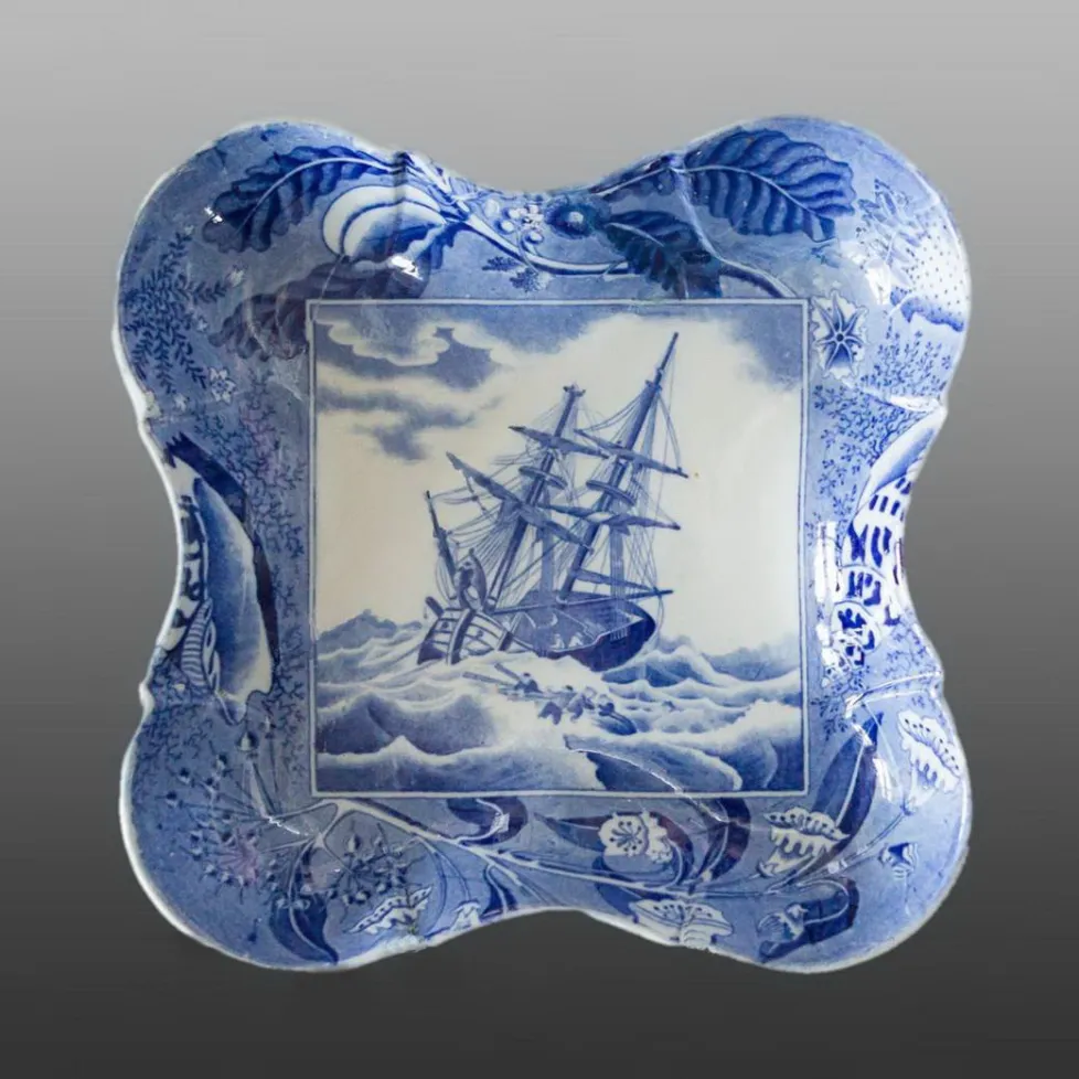 A qua-trefoil shaped earthenware dish printed in blue with a pattern named Shipwreck Scene.