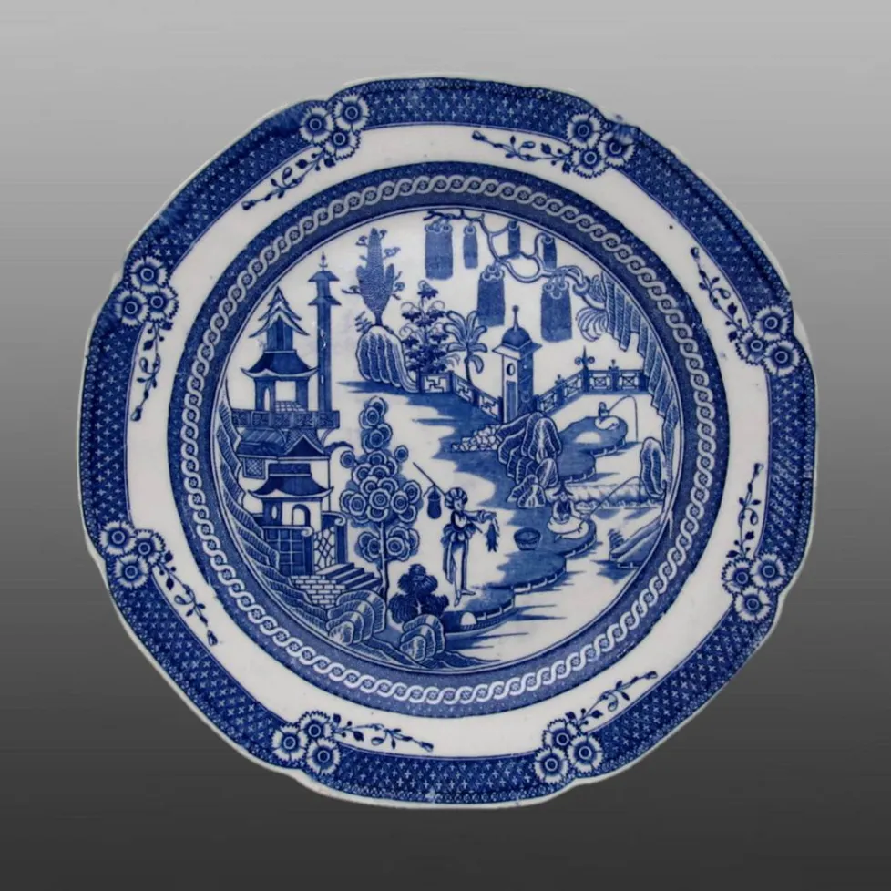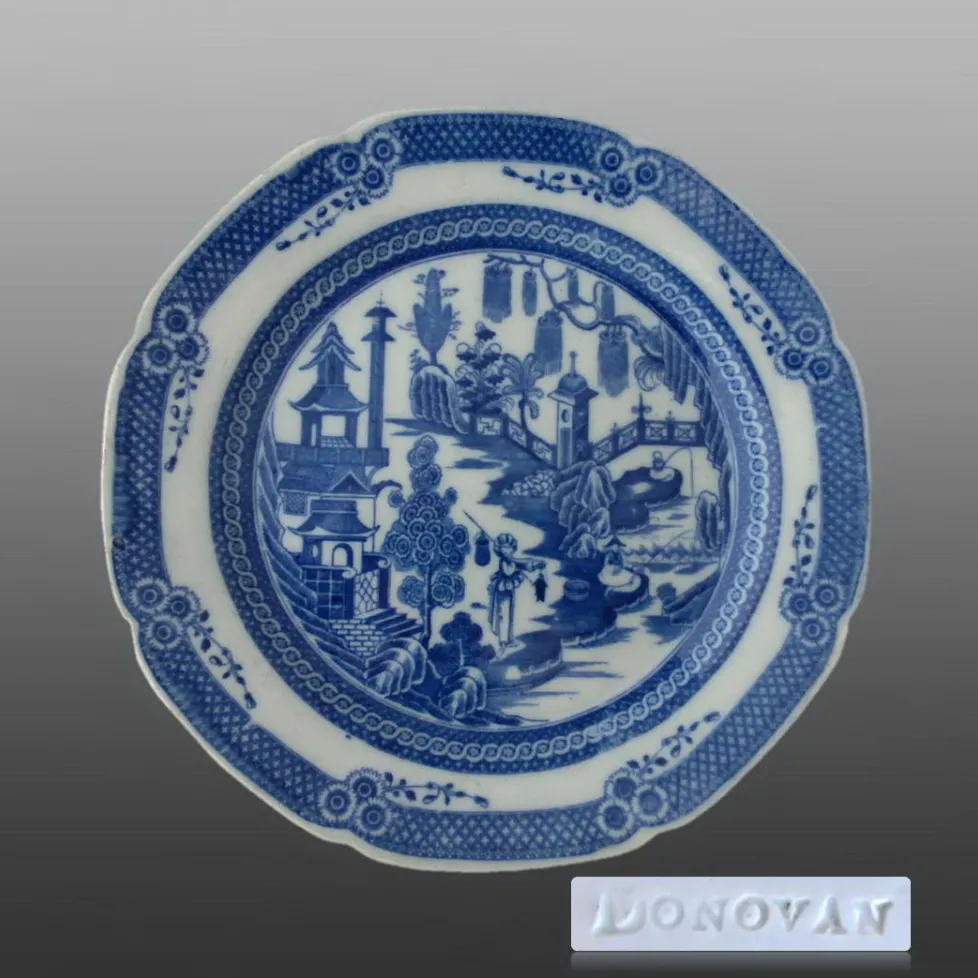 Earthenware plate printed in blue. The rim has eight light scallops and the bottom is flat without a foot ring. The pattern is known as Chinese Fishermen or Fishing Family. The makers mark is rare and found on early earthenware, it measures 1.75 inches by 1.875 inches. Also shown below is a the same pattern with an impressed "DONOVAN" mark which may be attributed to Davenport.BACK TO CATALOG INDEX