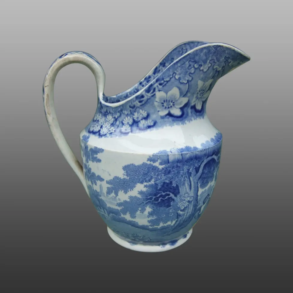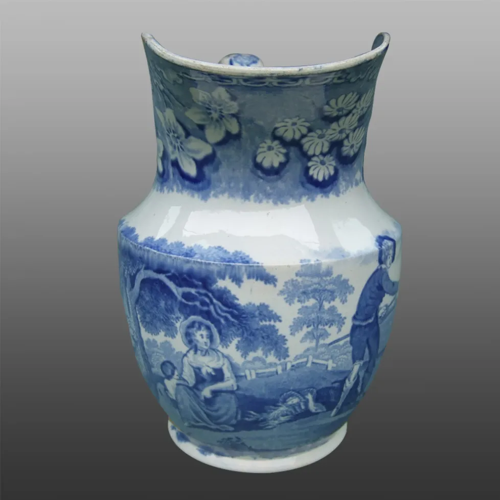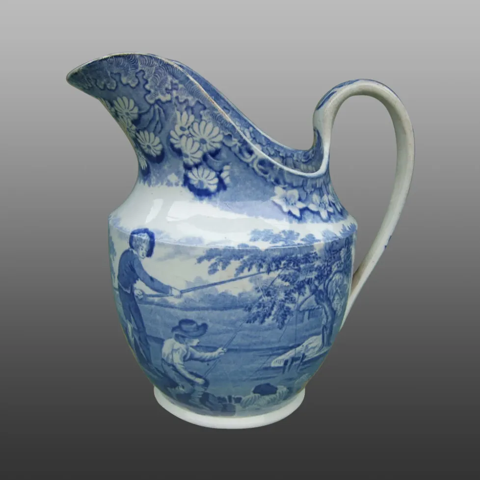 A tall earthenware ewer from a wash set printed in blue in the Boys Fishing pattern. While this piece is not marked, it is a documented Brameld pattern.BACK TO CATALOG INDEX